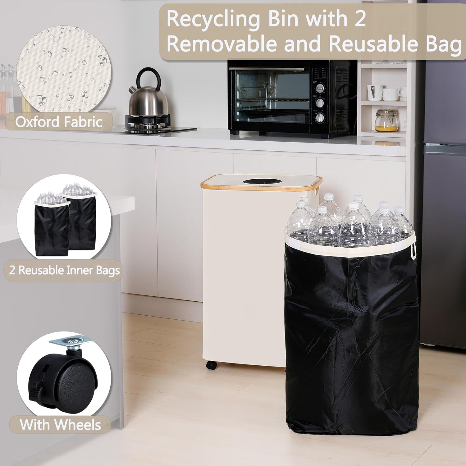 - 【Design with lid and bamboo handle】The recycling bin for kitchen has a collection hole, and you can easily put in empty bottles without opening the lid. The recycling bin for kitchen is made of Oxford cloth and bamboo basket, using environmentally friendly materials, lightweight, thick Oxford cloth is durable, not easy to damage, lightweight, breathable fabric, easy to clean.