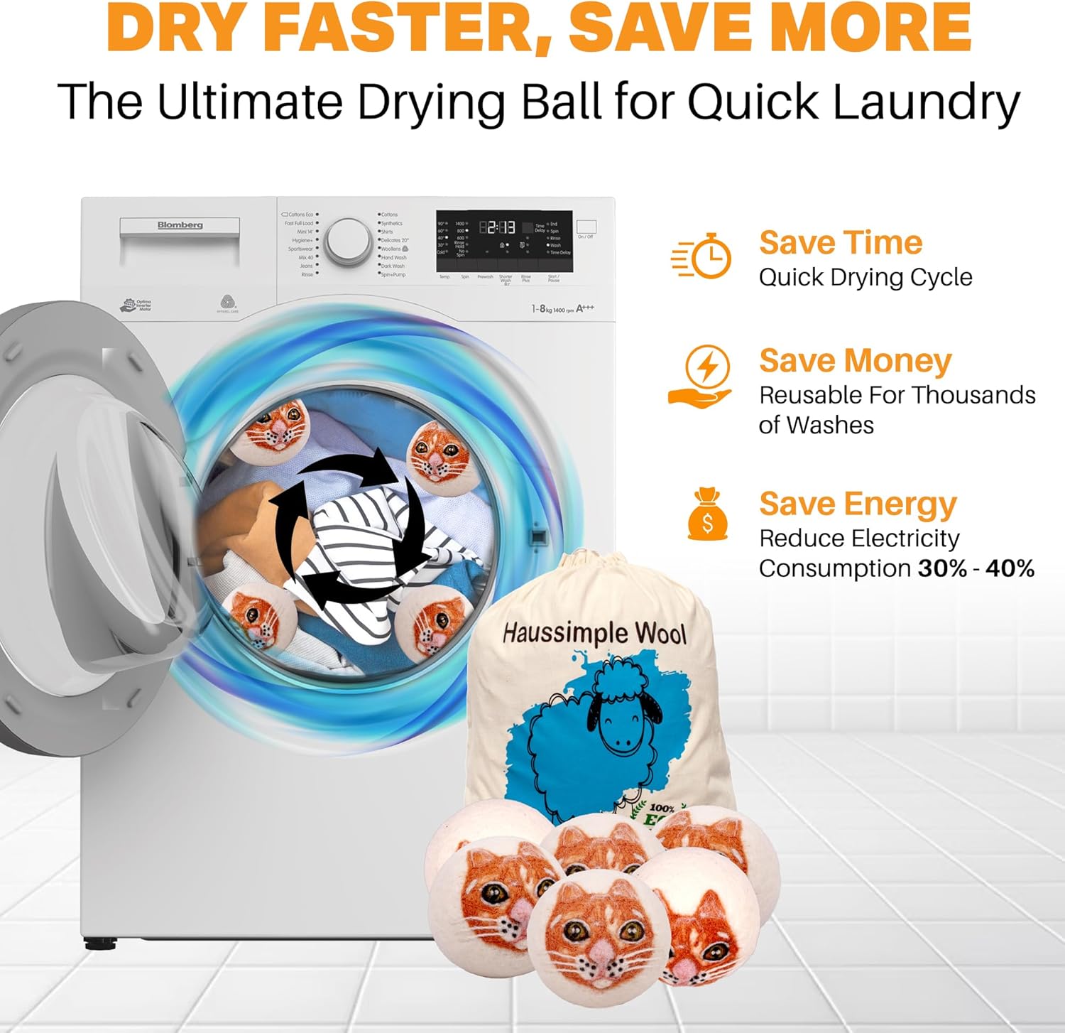 Wool Dryer Balls Organic Felt 6 Pack Laundry Fabric Softener, Extra Large Reusable Handmade Natural Sheep Wool Lint Wrinkle Free Anti Static Baby Safe (Orange Cat)