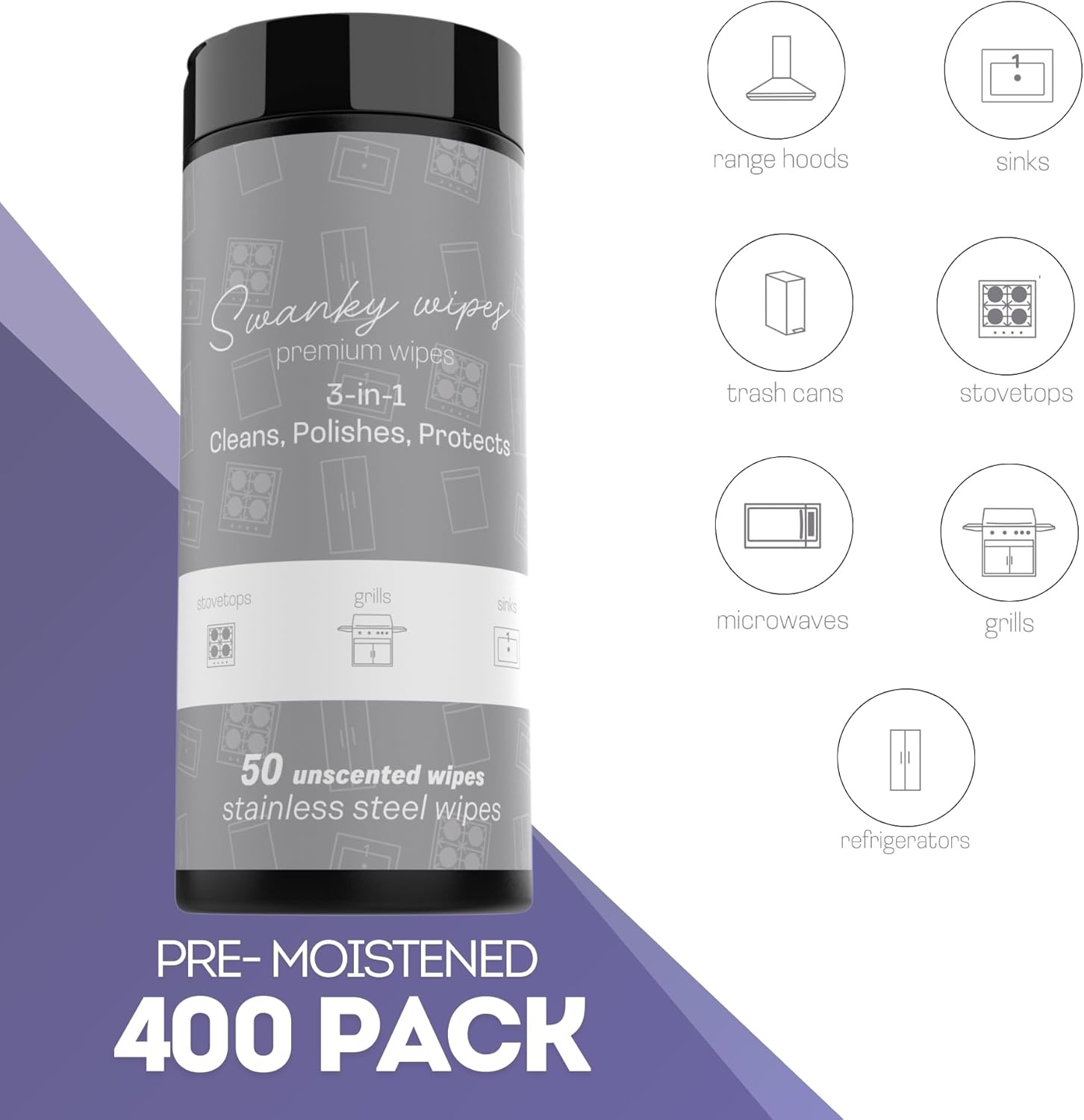 - PRODUCT SPECS - Swanky Stainless Steel Cleaning Wipes come in a pack of 400 soft, non-scratch wipes. Each wipe is pre-moistened and ready to use, making them a convenient addition to your cleaning supplies. Ideal for keeping your stainless steel appliances looking polished and clean.