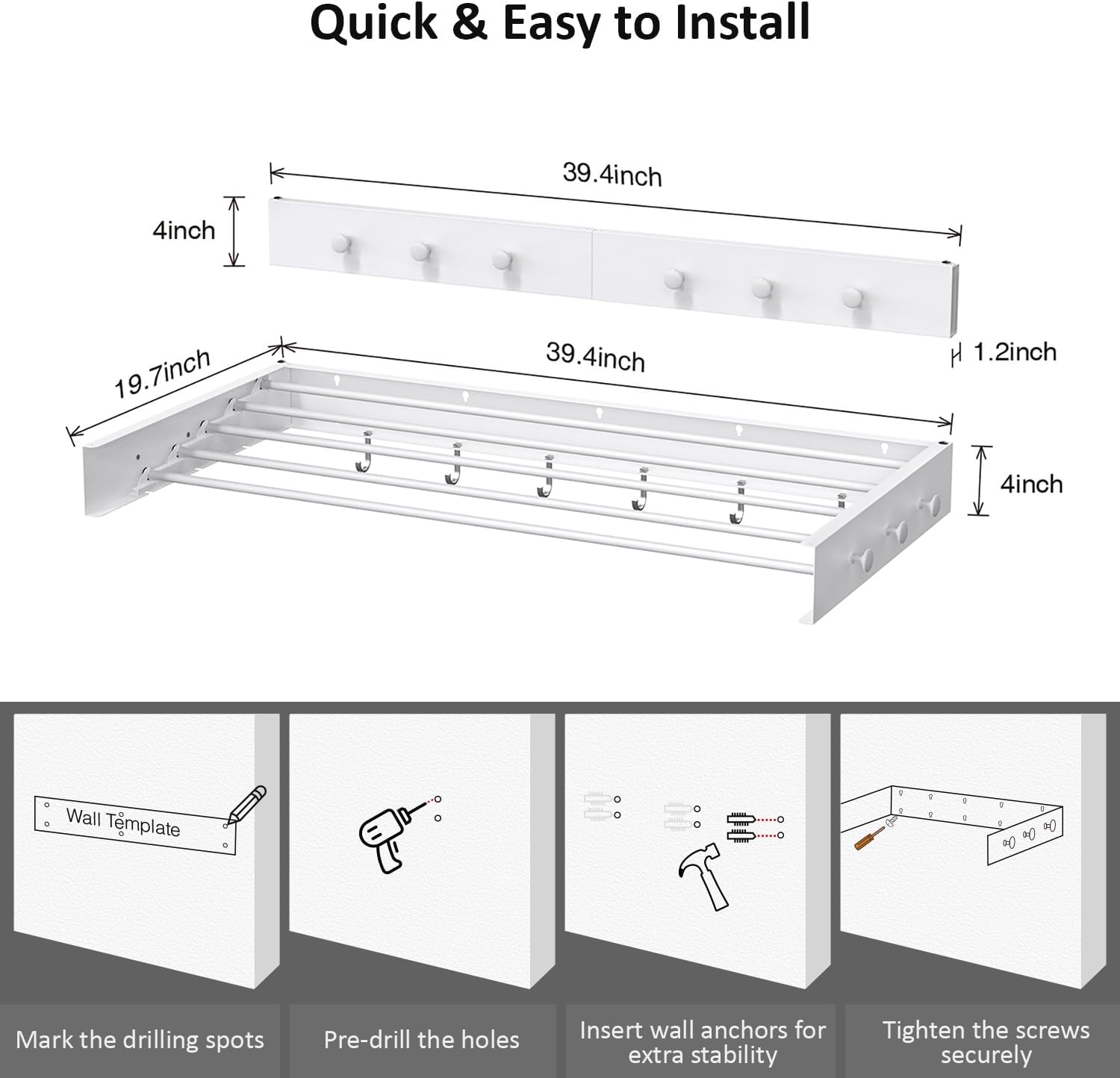 - 【Easy Installation】 The laundry drying rack wall mount package includes a wall template, a long screwdriver head, 10 screws.The wall mount clothes drying rack is pre-assembled, allowing for hassle-free mounting onto the wall - all that's required are a few drilled holes.Once secured, it's ready for immediate use!