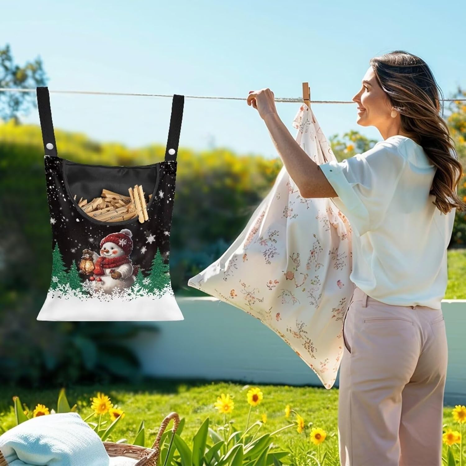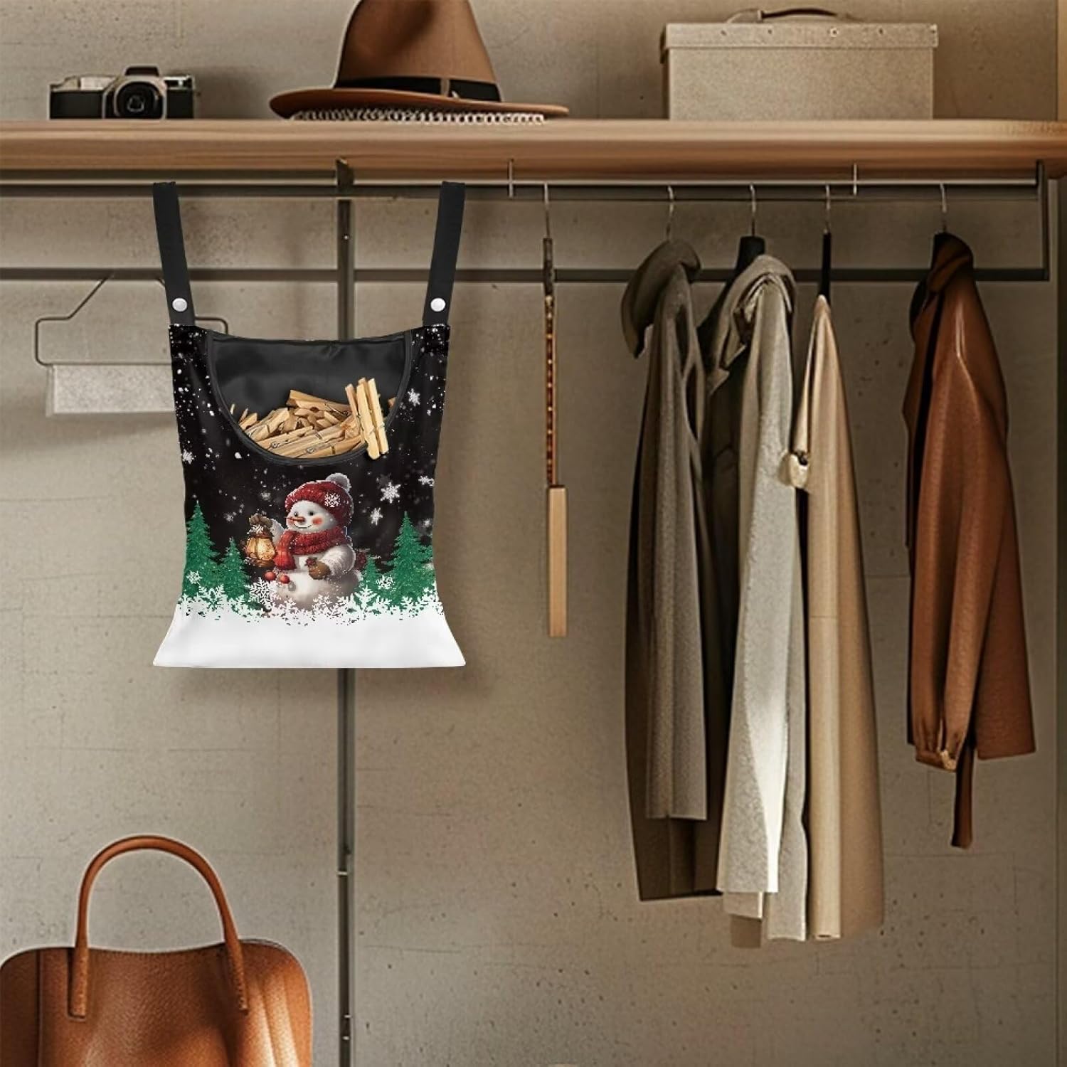 2 Pcs Snowman Clothes Pin Hanging Bag, Large Capacity Clothespin Bag with A Large Opening,Clothes Pin Hanging Bag Space-Saving Organize Clothespin Bag for Clothesline Outdoor