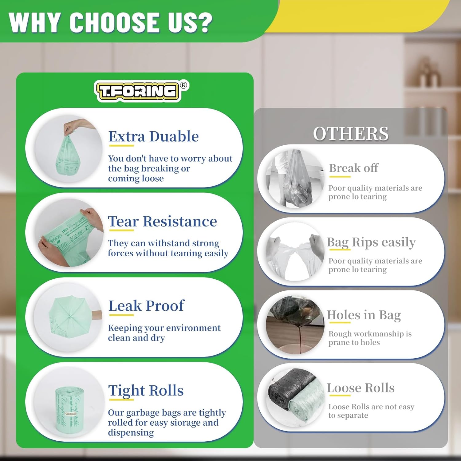 - 【Make Earth Better】T.FORING compostable bags are the ethical choice for a cleaner environment and an ECO-FRIENDLY future. Thank you taking care of our planet for FUTURE GENERATIONS by replacing plastic with our sustainably manufactured, compostable bags. Together, U ‘n’ I make Earth a better place.