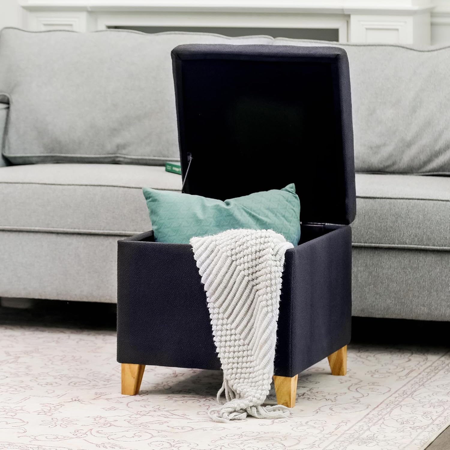Adeco Fabric Storage Ottoman Bench with Solid Wood Legs, 17.7" Square Dark Grey Cotton Linen Cube Foot Stool, Upholstered Button Tufted Vanity Chair with Hinged Lid for Living Room, Bedroom, Dorm