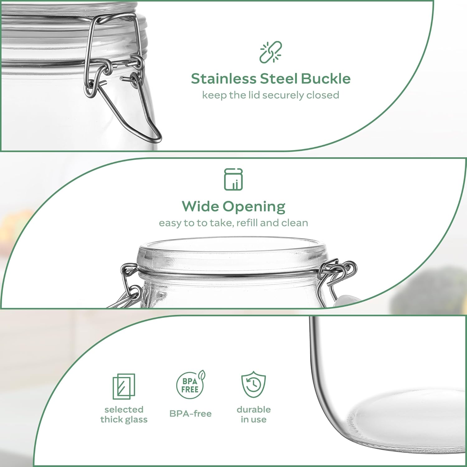 - Wide Applications: Our airtight storage jars are very versatile and can be used not only to store a wide variety of foods such as pasta, coffee beans, cookies, candy and spices, but also to pickle your own fruits and vegetables