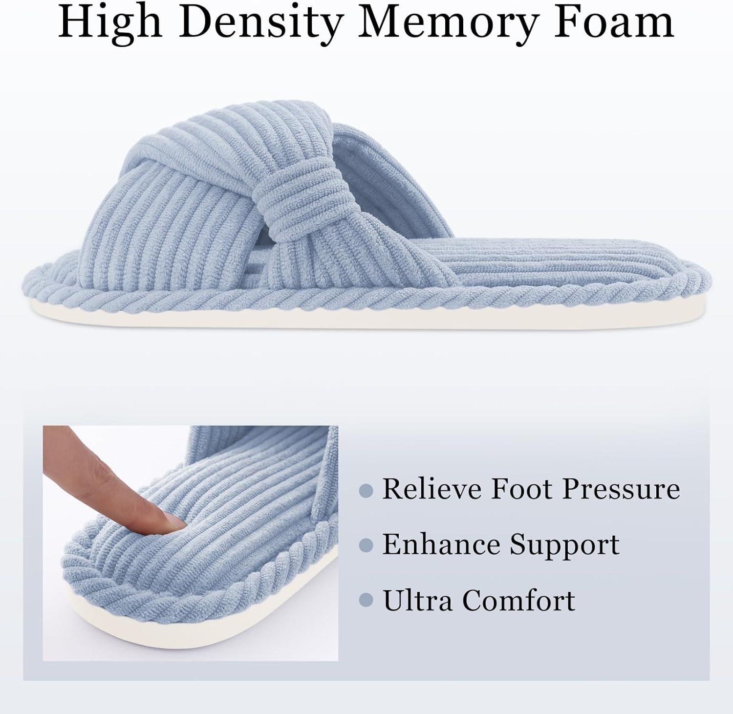Evshine Summer House Slippers for Women Corduroy Cross Bow Indoor Slippers Open Toe Slip On Bedroom Shoes with Memory Foam