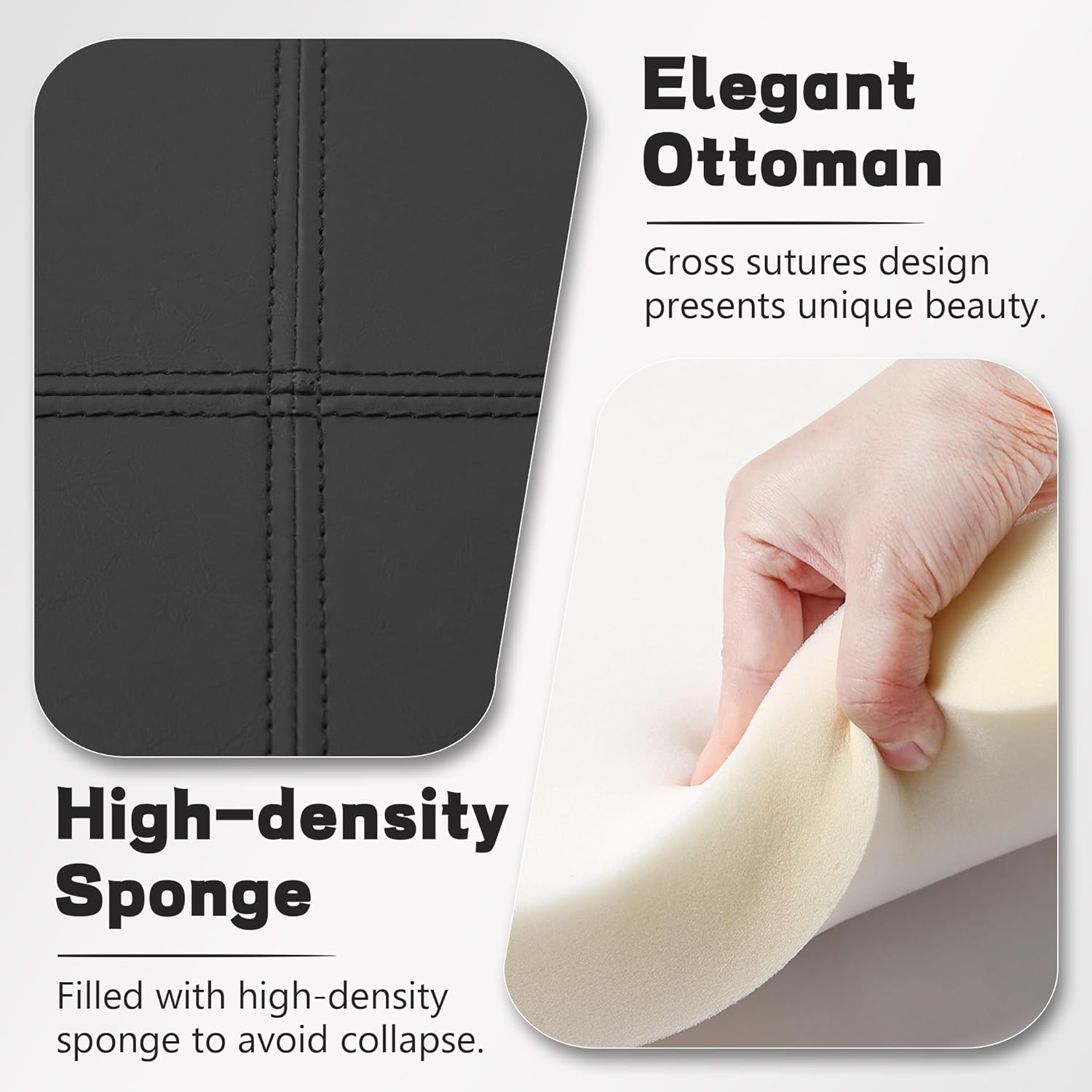 - Exquisite Design: PU leather fabric and hand-stitched top design gives this ottoman coffee table an elegant appearance. There is enough high-rebound sponge inside the top, which keeps the ottoman full and beautiful. Removing the things from top will not leave ugly indentations