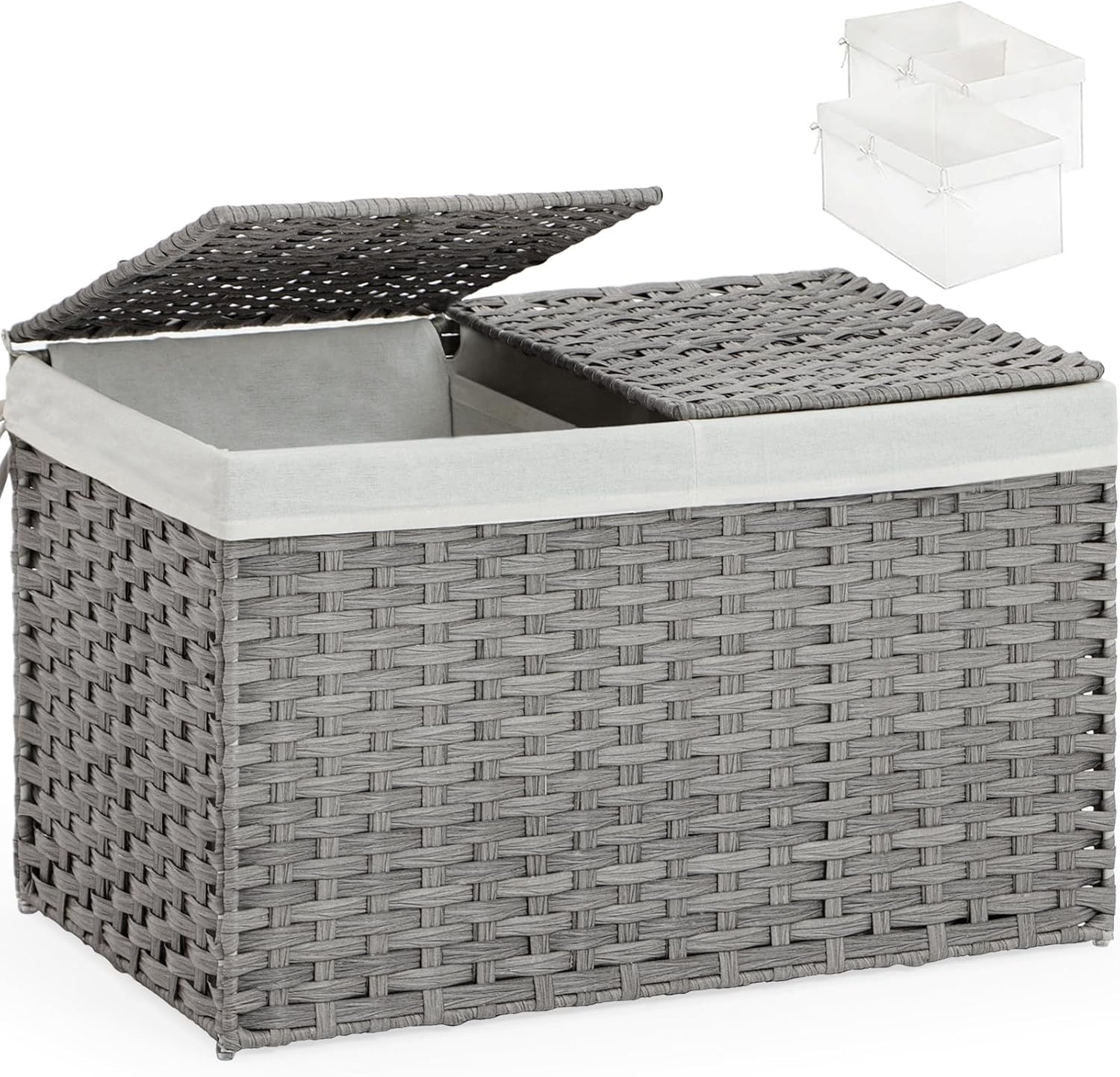Storage Basket with Lid Wicker Baskets for Storage with 2 Separate Lid 42.3 Gallon (160 L) 29.9 x 17.3 x 18.1 Inches Rattan Woven Large Wicker Basket with 2 Liners for Bedroom Laundry Gray