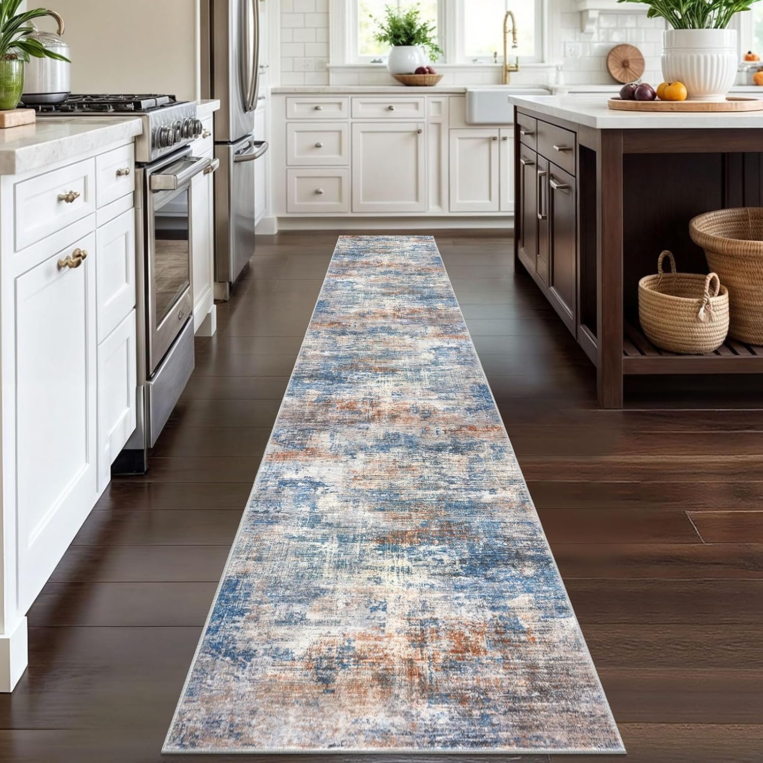 IOHOUZE Abstract Runner Rug 2x12 Ft Washable Runners for Hallways, Non Slip Kitchen Runner Printed Faux Wool Entryway Runner Indoor, Modern Abstract Floor Carpet for Hall Kitchen, Blue Rust