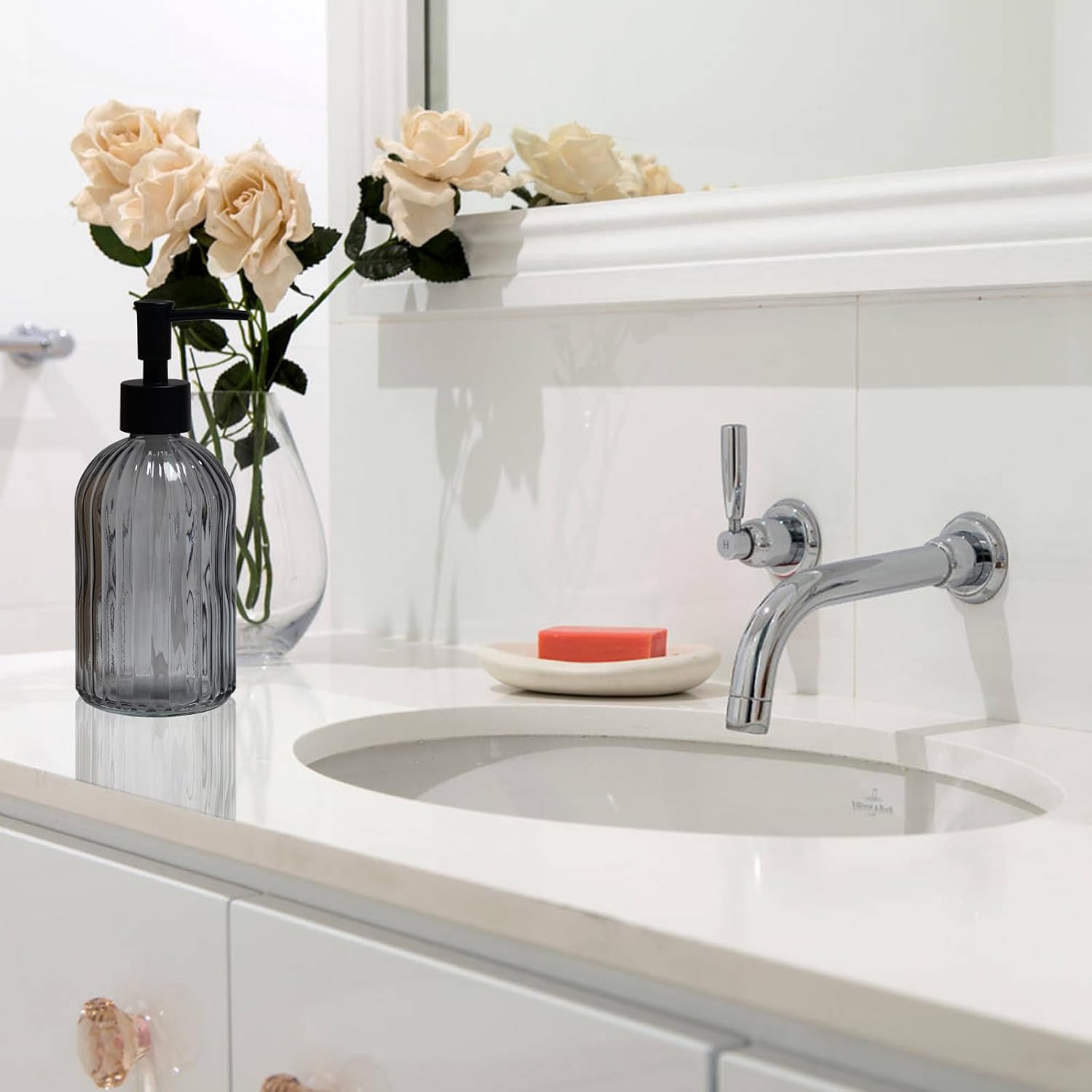 - Glass Soap Dispenser with Black Pump: Our grey glass soap dispenser is made of high-quality lead-free glass, naturally and safely filled with various indoor liquids for daily use. Glass lotion bottle is reusable, refillable, environmentally friendly, and recyclable.
