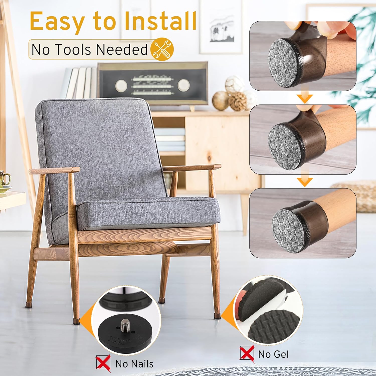 - ✅【Integrated Molding Process】Unlike traditional felt chair leg pads with glue or nails, we combine the felt and silicone into an integral part to prevent the felt pad from falling off during use. Additionally, the built-in bottom features a non-slip pattern to ensure that the chair sliders for wood floors stay securely in place without any risk of falling off.