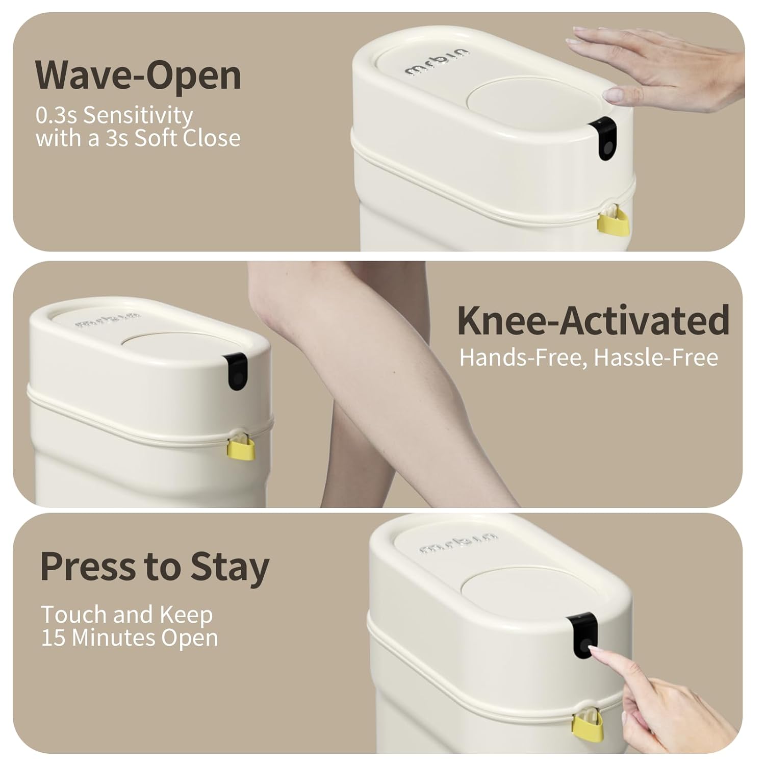 - Three-Way Motion Sensor Opener: The white bathroom trash can is equipped with a motion sensor that opens the lid in just 0.3 seconds. With sensors for waving, knee-nudged motion, and a Home button, it offers three convenient ways to access the waste bin quickly and easily.