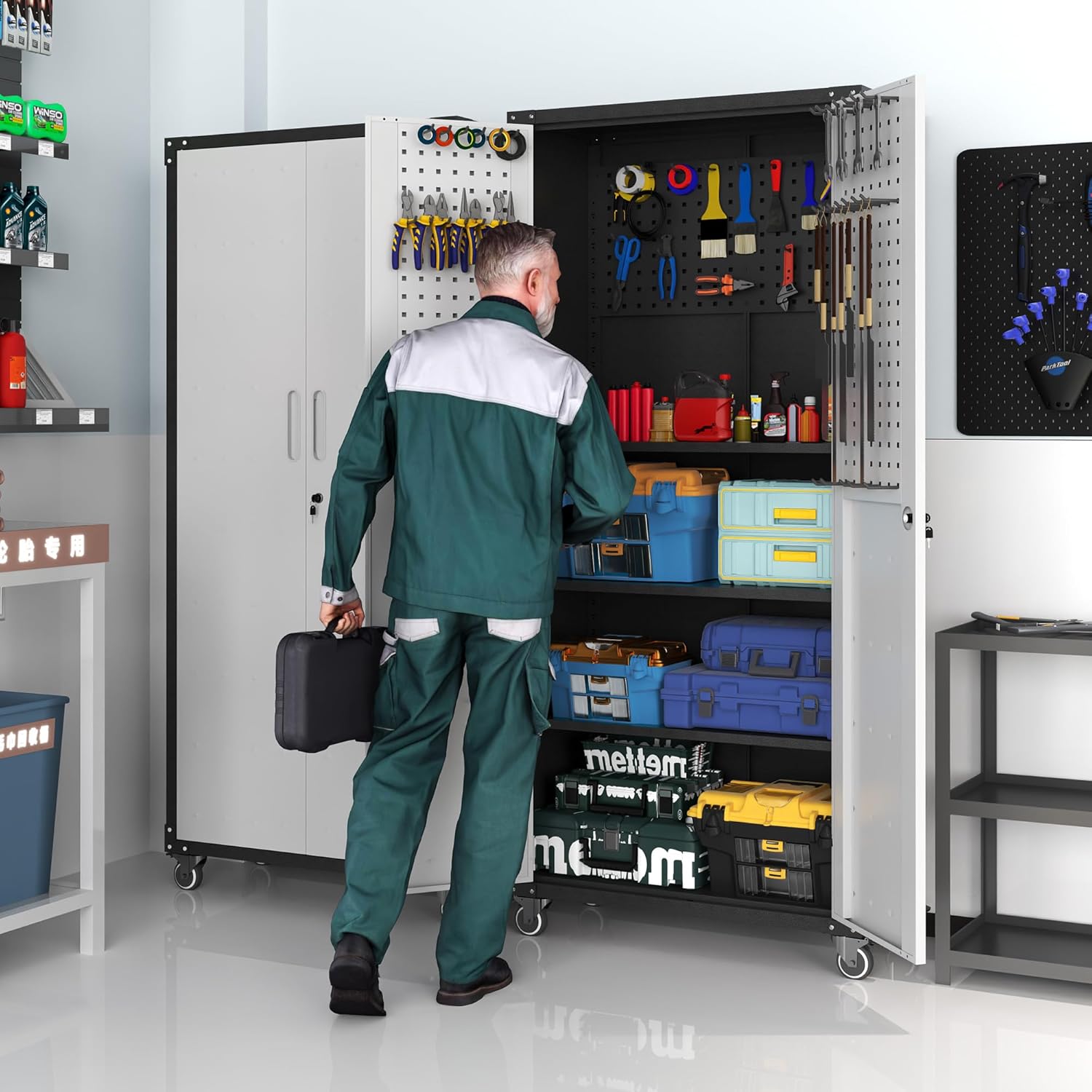 - Adjustable Shelves: This metal garage storage cabinet comes with 3 adjustable shelves and 2 tool pegboard that can be adjusted to different heights depending on the height of the items. The 2 tool pegboard can be hung inside the tool cabinet or on the wall, both of which are able to organise your tools effectively.
