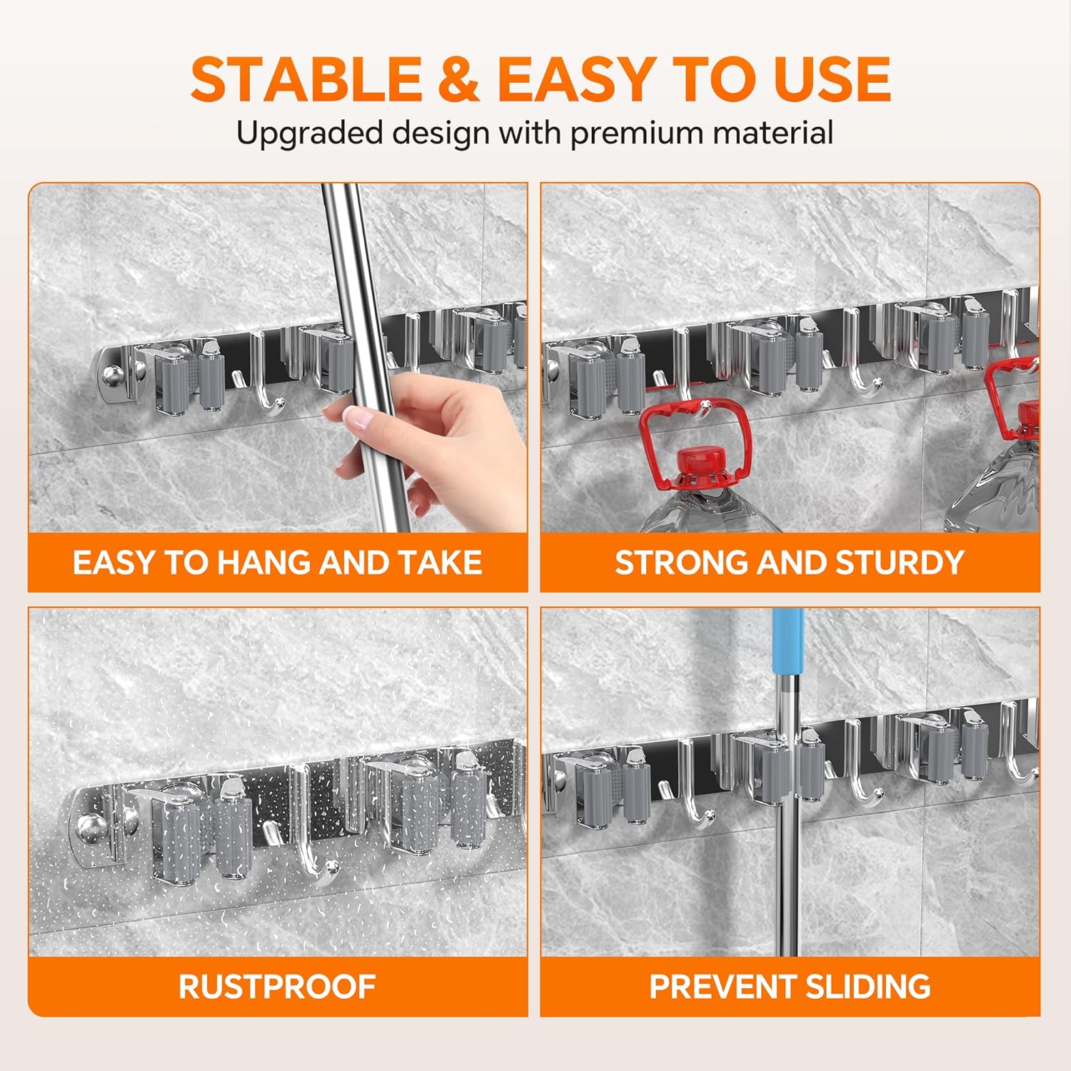- Space-Saving Mop and Broom Organizer - With 17-inch length design, this wall mount broom and mop holder features 5 rubber roller clips and 4 additional hooks, maximizing vertical storage space for brooms, mops, and various lightweight tools while keeping them neatly organized and easily accessible