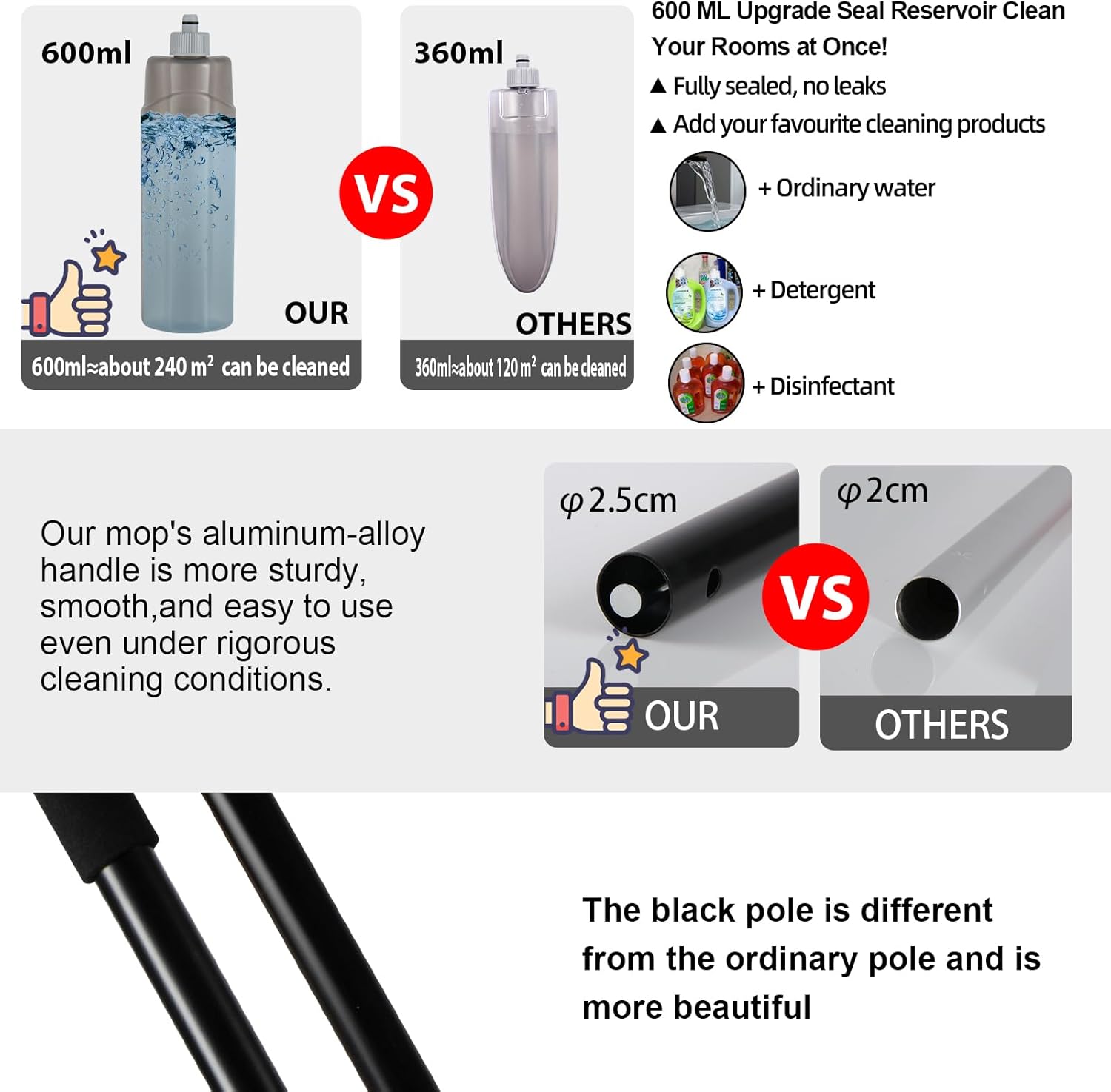 - Add your favorite cleaning solution: Just fill 600 ml refillable bottle with water and add 2 small teaspoons of your favorite cleaning solution and you are ready to shine your floors. NOTE: it is normal if there is a small amount of water inside the pipe, Because of our mop was tested with water spray before packaging to ensure that you can use them normally . And if you have any problem, contact us