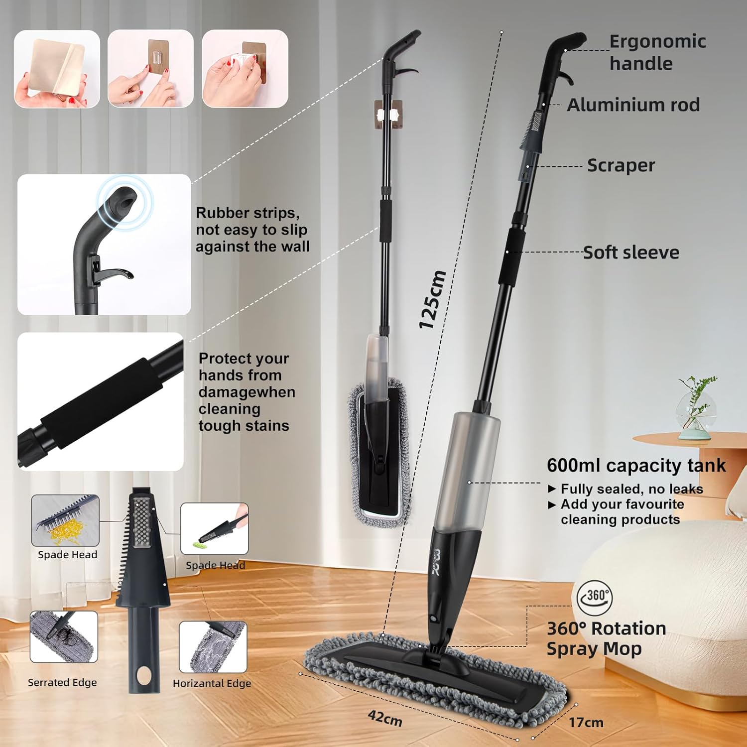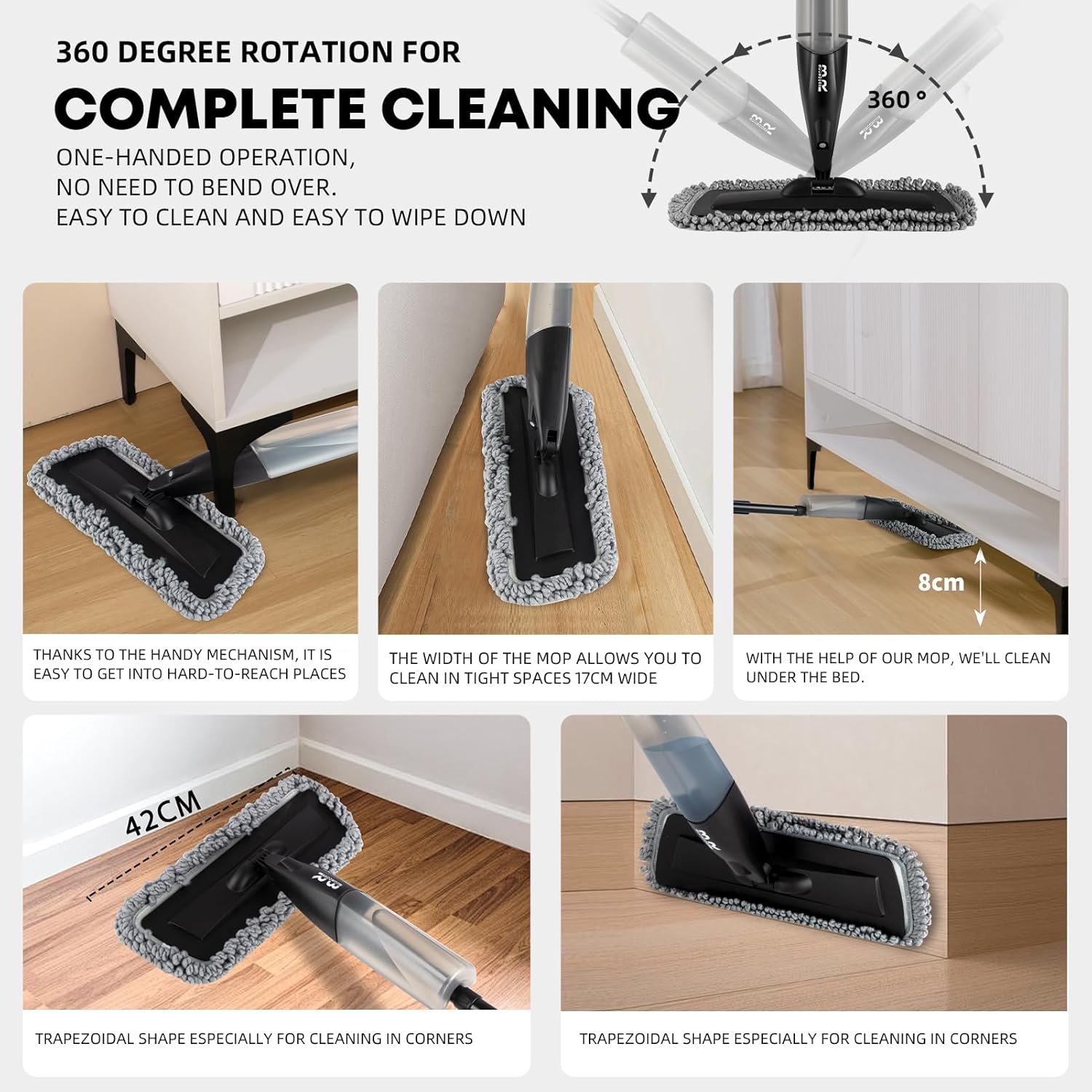 - Flexible 360° Rotating Mop Head: With flexible 360° rotating head, the spray floor mop can be adjusted to any angle you need, so you could clean deep, narrow and any hard-to-reach corners of your house easily and quickly