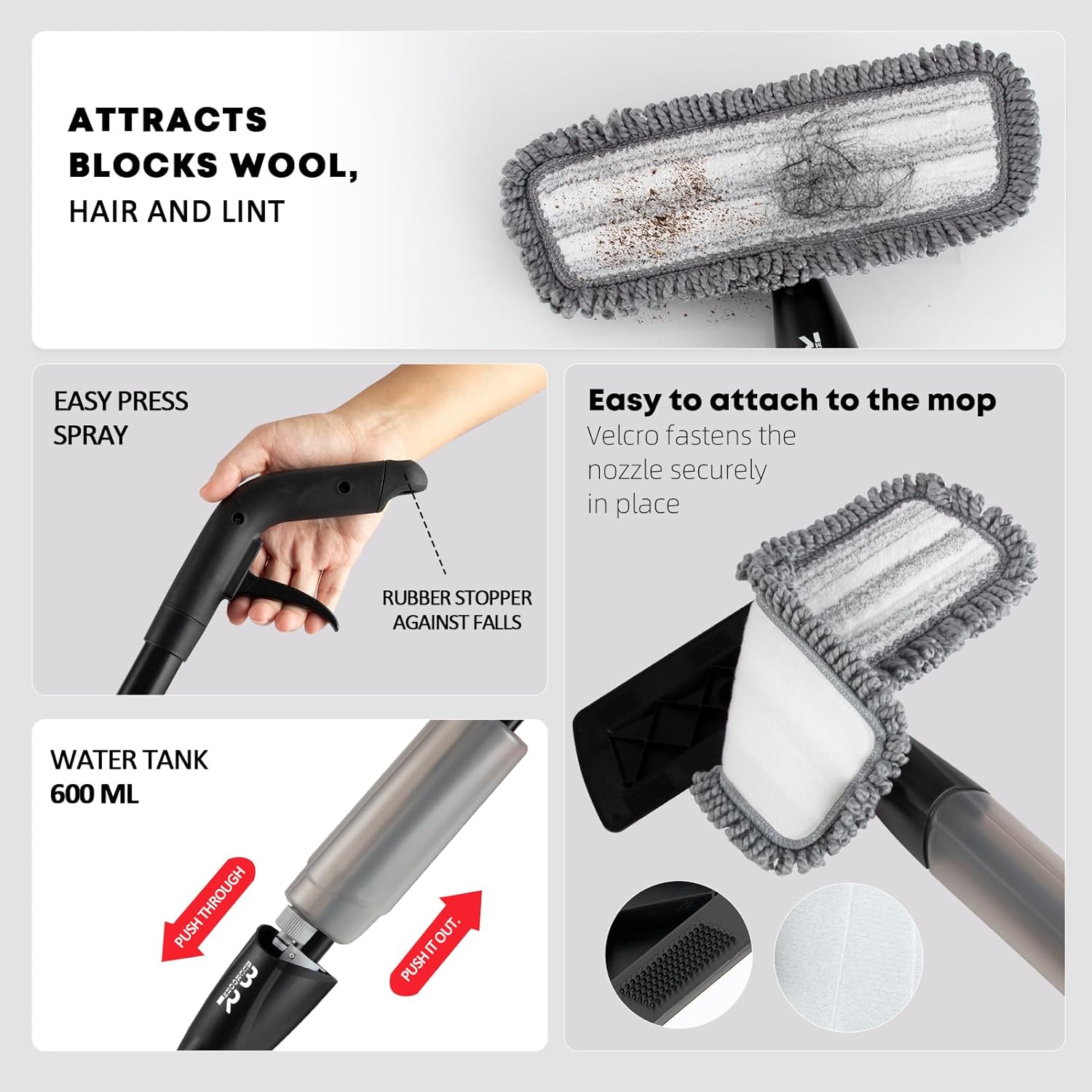 - Quick Assembly : Microfiber mop pad attaches easily to the mop head with velcro for a snug fit. Just snap the parts into place and follow the steps to attach the mop head and mop body together. Fill the bottle, pull the trigger to release the spray mist, and start mopping effortlessly. Upgraded sprayer ensures long-term use. Perfect for any occasions, kitchen, bathroom, etc