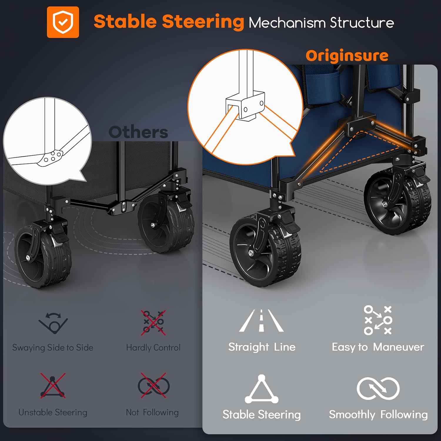 - 【𝗣𝗮𝘁𝗲𝗻𝘁𝗲𝗱 𝗦𝘁𝗮𝗯𝗹𝗲 𝗦𝘁𝗲𝗲𝗿𝗶𝗻𝗴 𝗠𝗲𝗰𝗵𝗮𝗻𝗶𝘀𝗺 & 𝗔𝗱𝗷𝘂𝘀𝘁𝗮𝗯𝗹𝗲 𝗥𝗲𝗯𝗼𝘂𝗻𝗱𝗮𝗯𝗹𝗲 𝗛𝗮𝗻𝗱𝗹𝗲 𝗙𝗼𝗹𝗱𝗶𝗻𝗴 𝗪𝗮𝗴𝗼𝗻 𝗖𝗮𝗿𝘁】This foldable cart features an stable innovative steering mechanism structure, Restoring the swaying 3-point handle-frame connection, resolving the problems of swaying side to side, loss of control, and steering difficulties of similar carts, significantly enhanced stability and maneuverability. A rebound adjustable handle with the lock can be freely adjusted in length, suitable for all types of people.