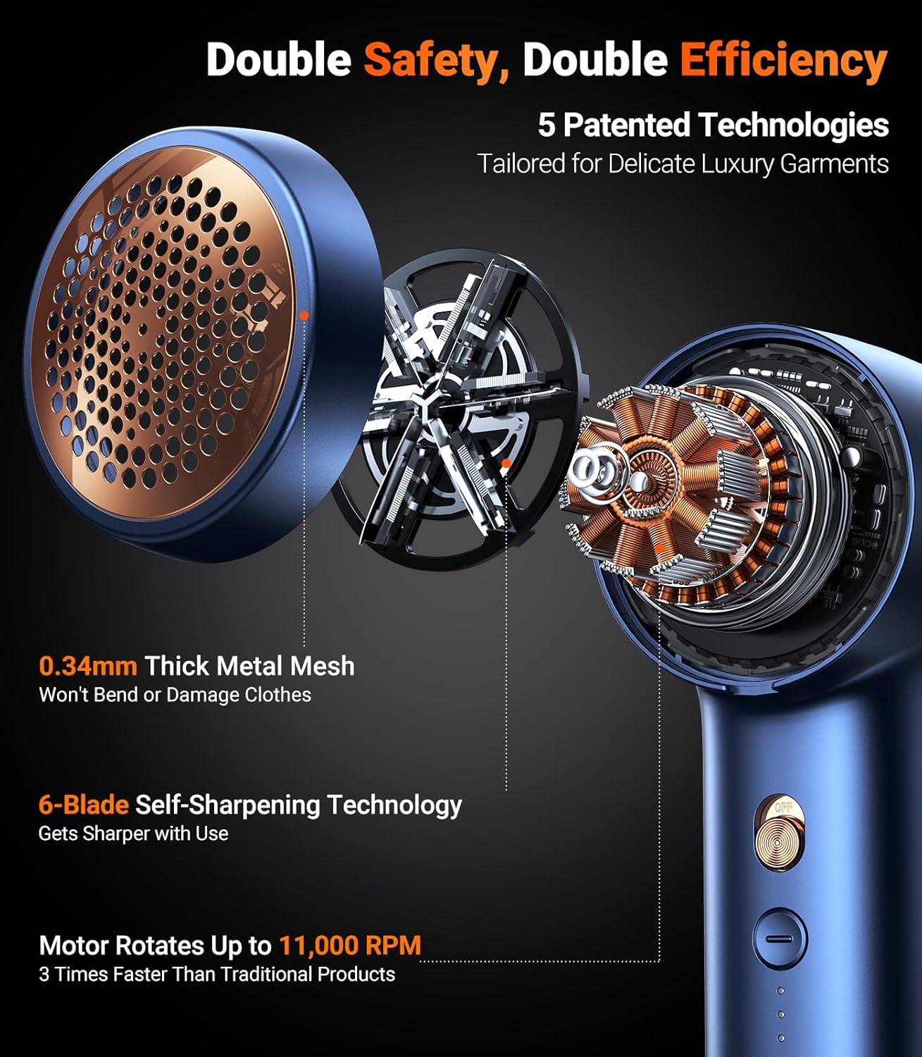 - [Triple Safety Protections] Protect your luxury clothing with triple safety protection mode. Once you open the net cover and lint container, the lint shaver rechargeable will automatically cut off the power to ensure the fabric's good condition and your safety. The electric lint remover for clothes maintains a safe distance between fabric and blades with the suck-shave technology, preventing clothing damage. Revitalize the fabrics in your cozy home with a brand new freshness.