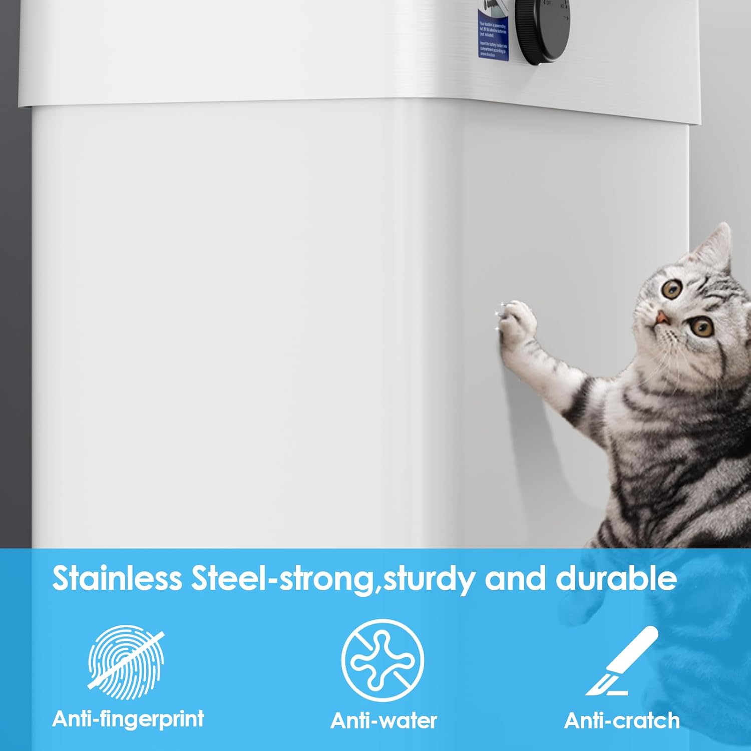 - 【Low Battery Reminder】Stainless steel trash can operates on four 1.5V AA batteries (not included).Trash can delayed sensing can prevent accidental sensing and save more power.When the voltage drops below 4.8V, the low battery reminder red light will flash, reminding you that you need to replace battery