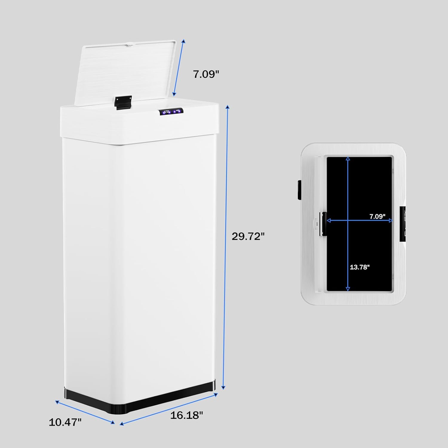 - 【Soft-Close Lid and Integrated Design】Sensor trash can lid has a slow-closing function, ensuring each closure is gentle and quiet, reducing noise and disturbance to nearby people while also enhancing the trash can's sealing ability. Trash can opening measures 13.78 × 7.09 inches, making it easy to deliver even large items