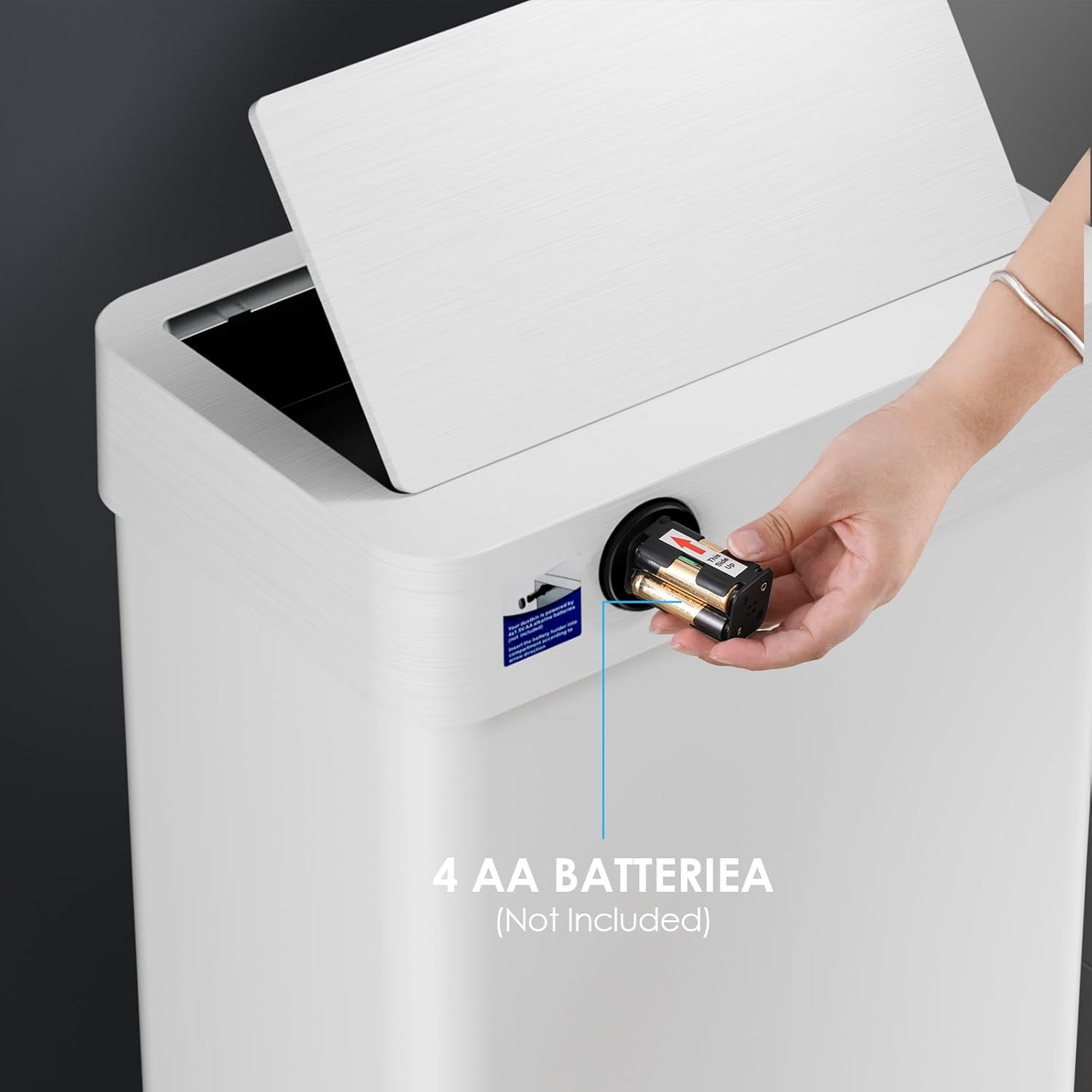 - 【Low Battery Reminder】Stainless steel trash can operates on four 1.5V AA batteries (not included).Trash can delayed sensing can prevent accidental sensing and save more power.When the voltage drops below 4.8V, the low battery reminder red light will flash, reminding you that you need to replace battery