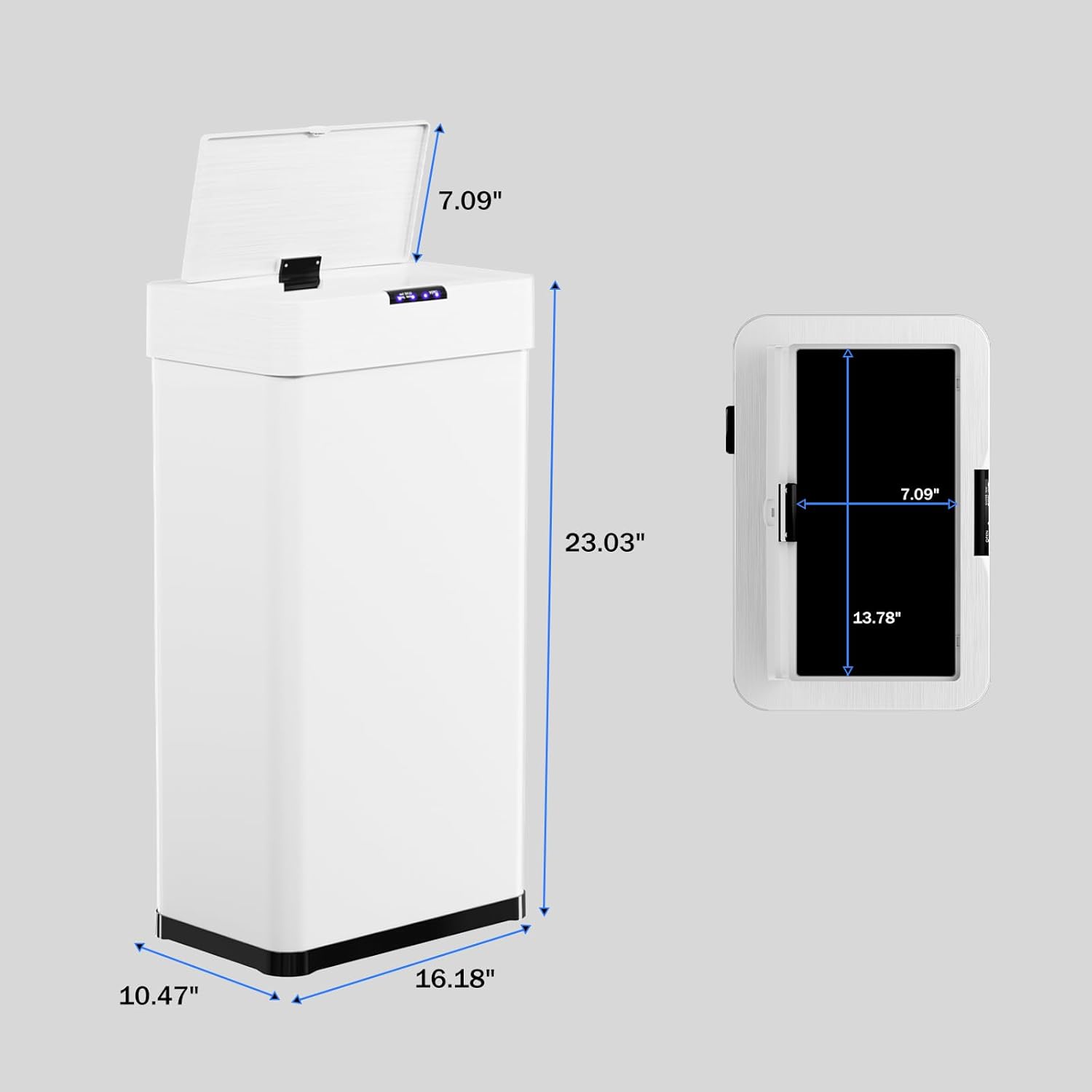 - 【Soft-Close Lid and Integrated Design】Sensor trash can lid has a slow-closing function, ensuring each closure is gentle and quiet, reducing noise and disturbance to nearby people while also enhancing the trash can's sealing ability. Trash can opening measures 13.78 × 7.09 inches, making it easy to deliver even large items
