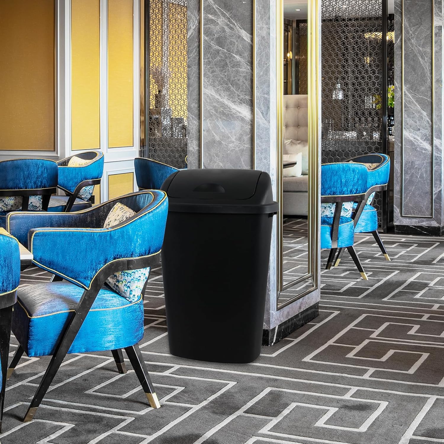 - The garbage bin is designed with a swinging lid that can automatically close after throwing away garbage to prevent the spread of odors
