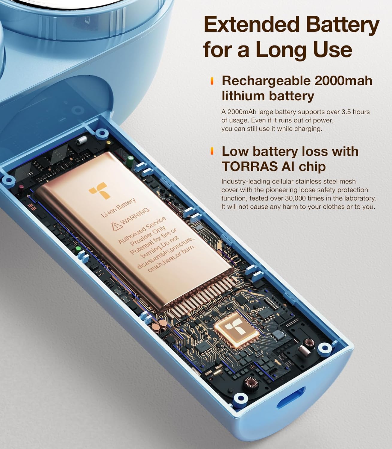 TORRAS Dual-Head Fabric Shaver, Longest Durability & 50ml Large Capacity Rechargeable Lint Removers to Remove Pills, 6-Leaf Blades Defuzzer, Electric Shaver for Clothes Couch Furniture, Sky Blue