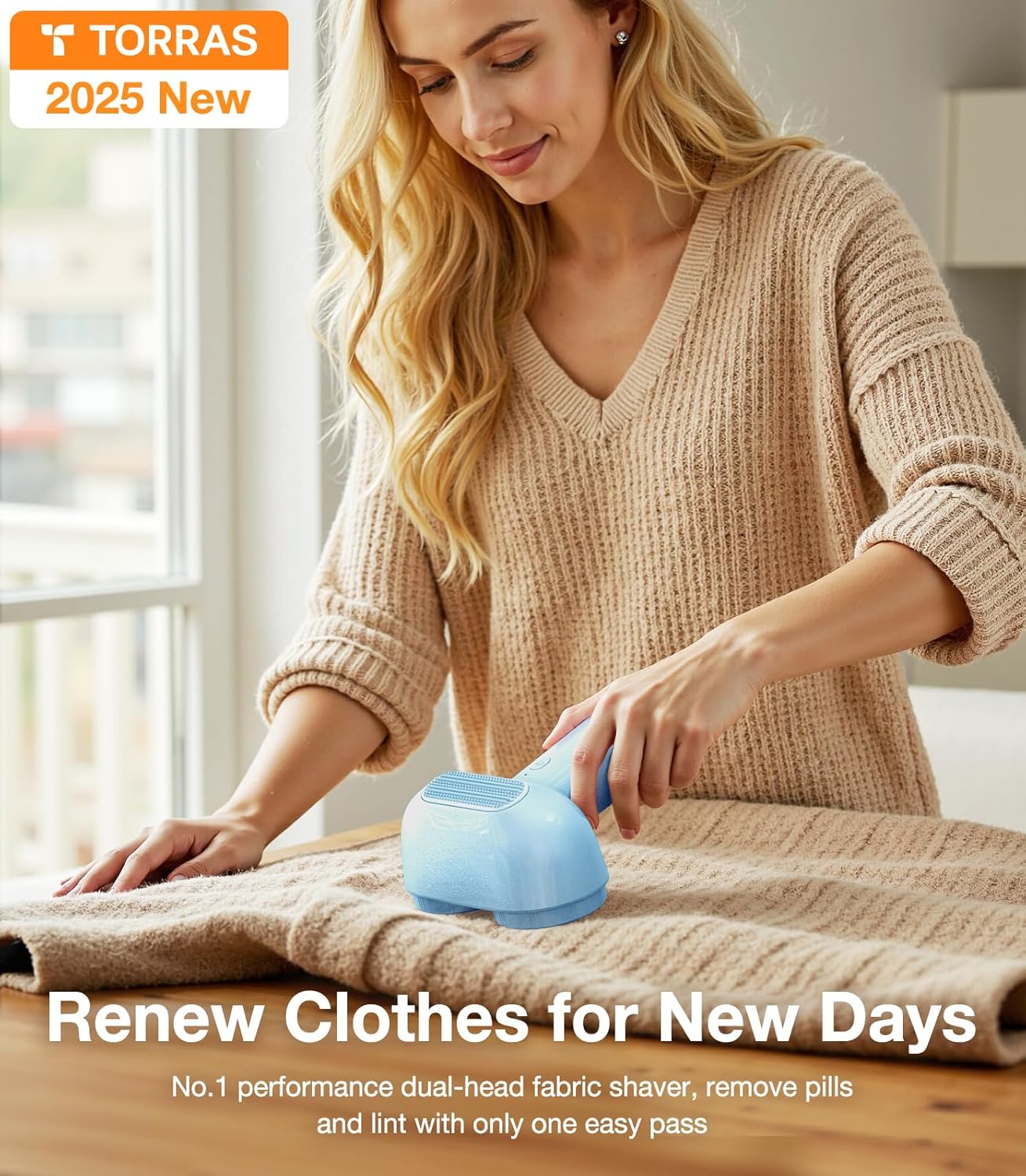 - 【NO.1 Efficiency with Dual-Head Shaving】With dual-motor and 6-leaf stainless titanium blades, the shaving is 200% faster and more effective. It can effectively remove 44c㎡ at a time, while others only cover 4c㎡. With only one pass, TORRAS dual-head fabric shaver makes clothes look new again quickly and efficiently, and causes zero damage to all kinds of fabric.
