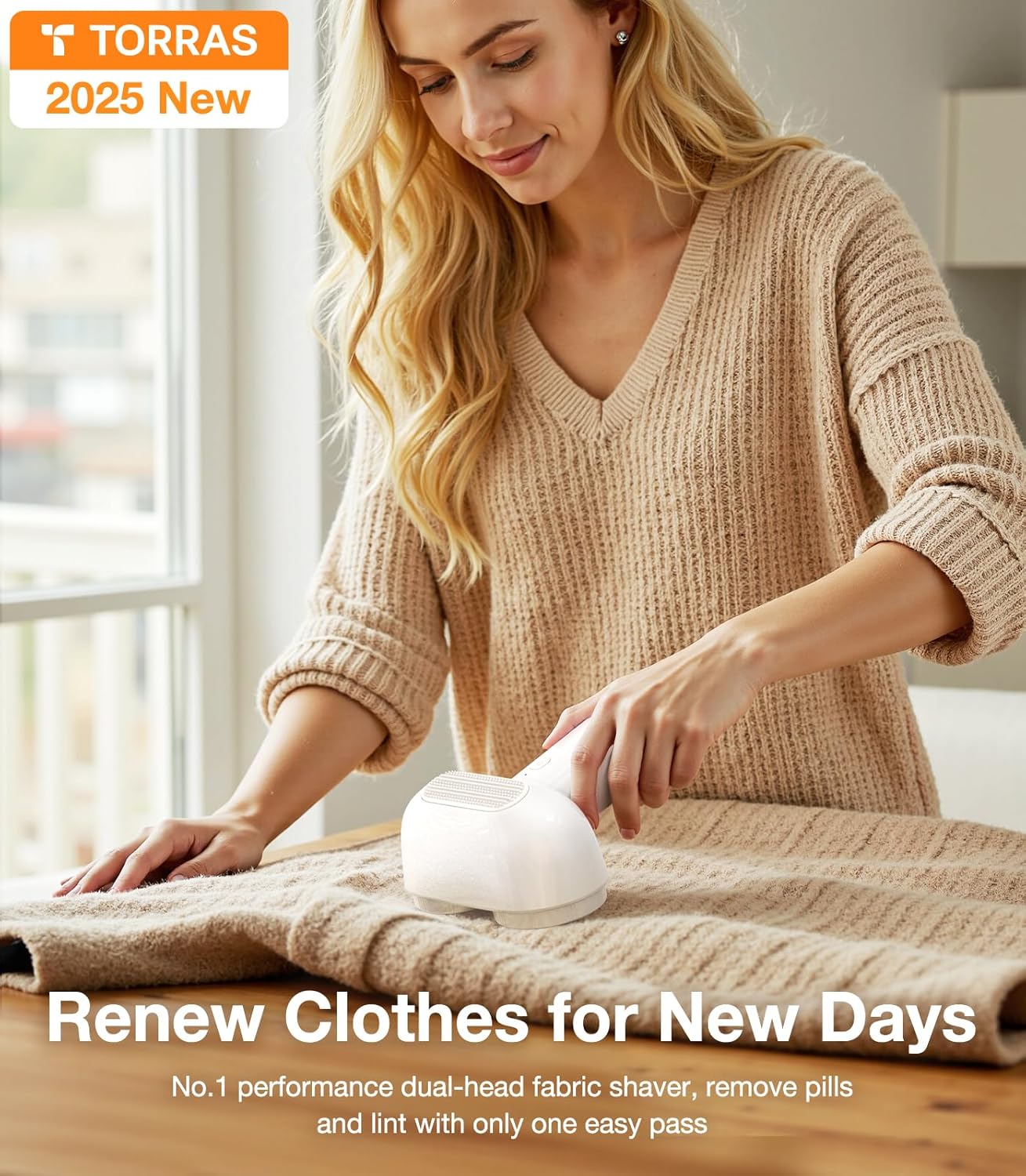 - 【NO.1 Efficiency with Dual-Head Shaving】With dual-motor and 6-leaf stainless titanium blades, the shaving is 200% faster and more effective. It can effectively remove 44c㎡ at a time, while others only cover 4c㎡. With only one pass, TORRAS dual-head fabric shaver makes clothes look new again quickly and efficiently, and causes zero damage to all kinds of fabric.