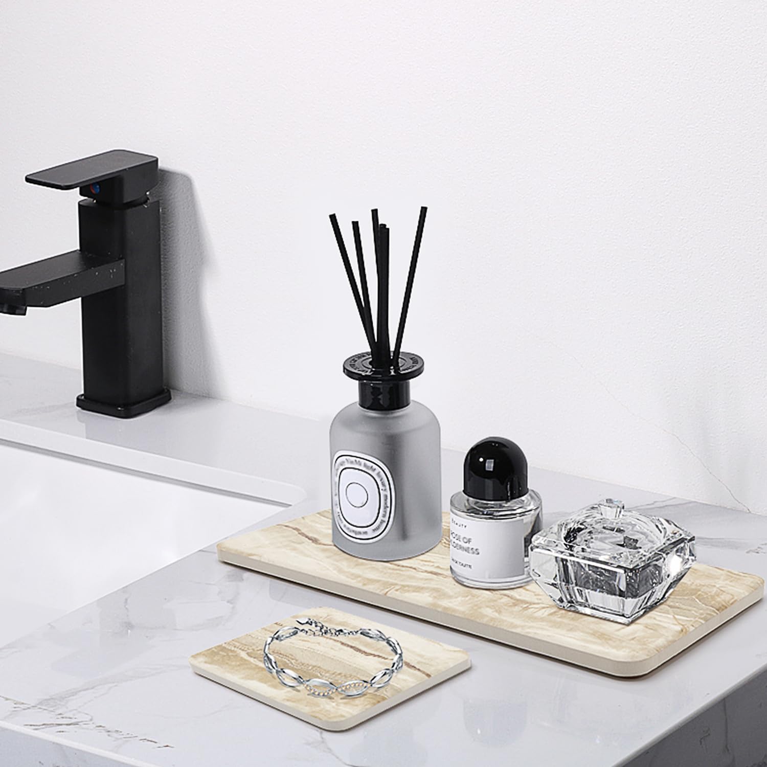 - INSTANT WATER ABSORBING: Made of absorbent ceramic with tiny porous, the fast drying stone trays soak up water quickly and dry in minutes, that can keep your bathroom countertop or kitchen sink dry and tidy.