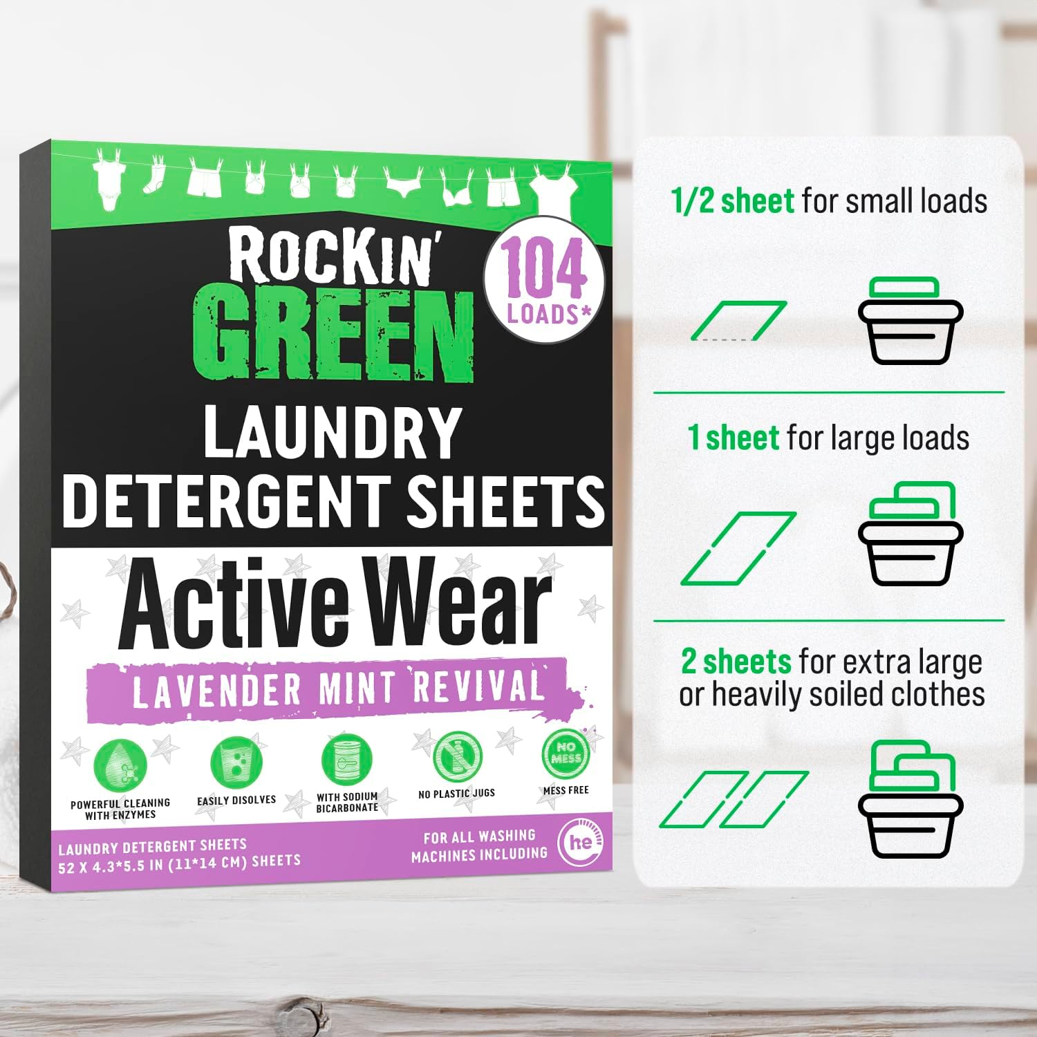 Rockin' Green Active Wear Travel Laundry Detergent Sheets - Mess-Free Laundry Sheet Detergent with Sodium Bicarbonate - Easily Dissolvable Laundry Soap Sheets (104 Loads, Lavender Mint Revival)
