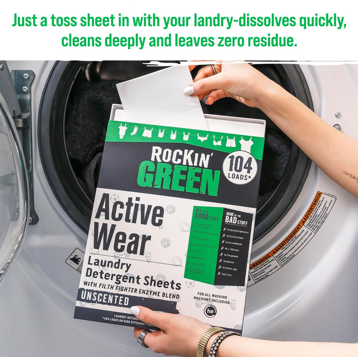 - Rock the Green Lifestyle – We are on a mission to create hardworking cleaning products to meet the demands of every family. Join the Rockin’ Green movement and enjoy safe and reliable eco friendly laundry detergent! If you are not satisfied with your purchase, contact our customer support, and we'll get back to you.