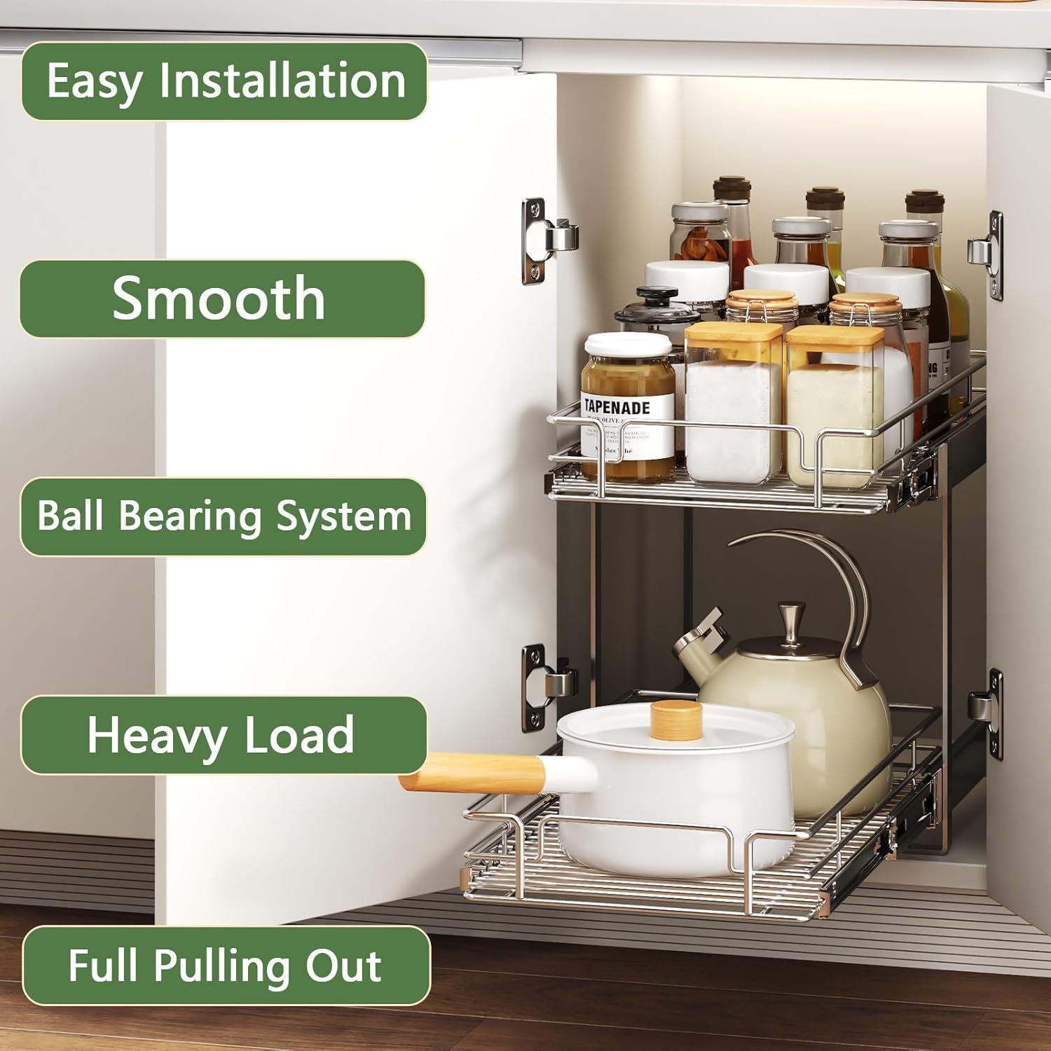 - 【Efficient Kitchen Organizer】Features a full-extension ball-bearing system which slides smoothly; Durable and strong organizer that can hold up to 100-pounds of weight.