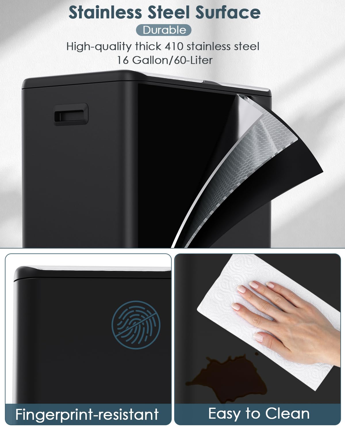 - Stainless Steel Outer &ABS Inner: Step trash can is made of 410 steel metal with a durable surface that is fingerprint-resistant, stain-resistant and easy to clean, you just need to wipe the surface of the trash cans with a damp cloth. Inner buckets are made of ABS material. And bucket is with pocket holes so that you can fix the plastic bags in place.