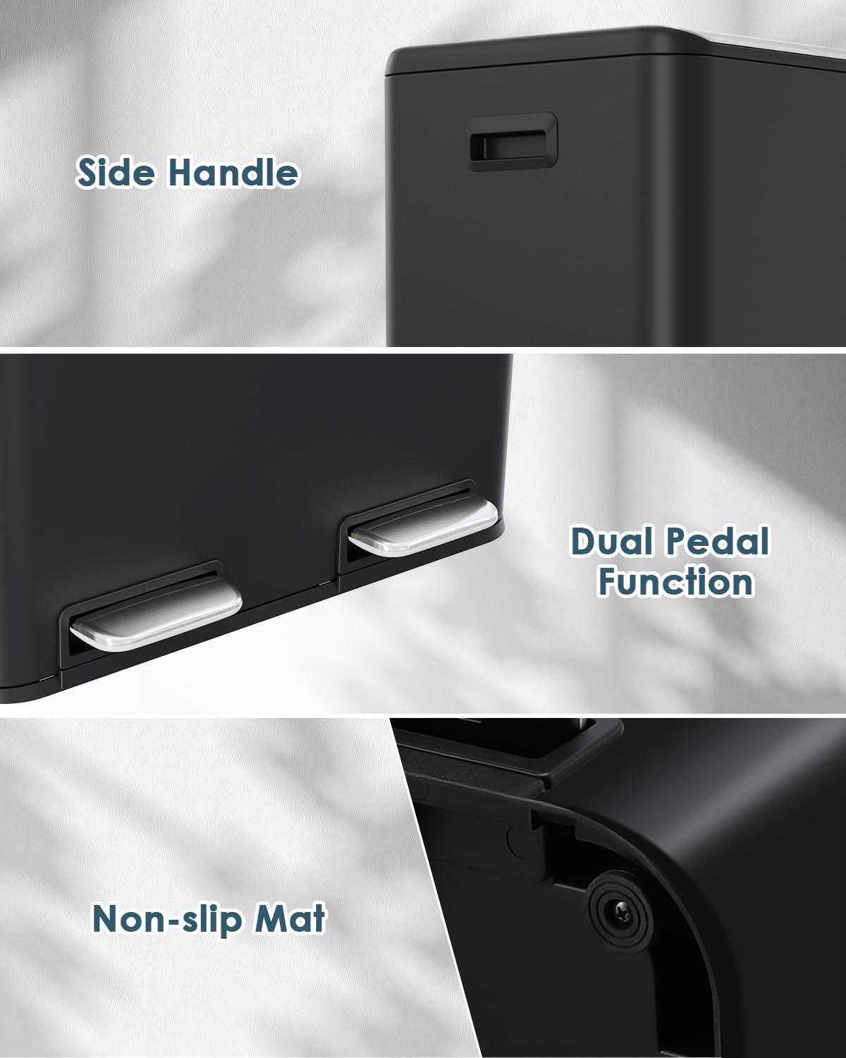 - Sealing Base&Soft Close: Recycling bin uses sealing base, which is effectively pet-proof and waterproof. And anti-slip rubber pads can prevent trash can from toppling over. Once your foot leaves the pedal,trash can lid will drop down automatically and quietly. Slow-closing lid design prevents sudden banging noises.
