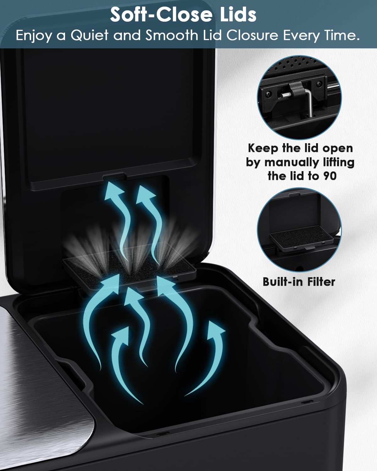 - Built-in Box for Odor Control: Dual trash combo is perfect for the kitchen. Both lids are equipped with built-in box for storaging cleaning material for helping to improve the air quality around the trash can. Enjoy a clean and pleasant environment.