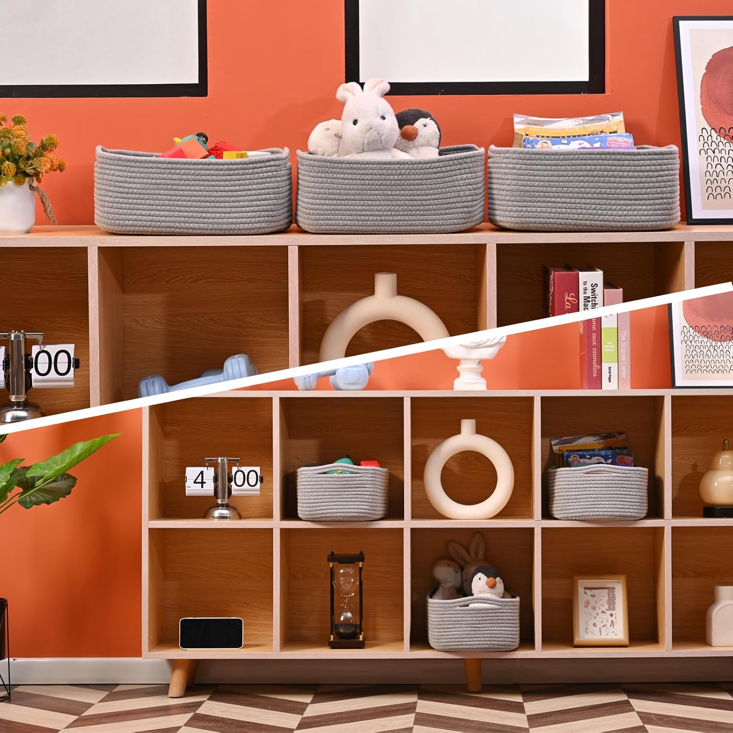 - Gray Baskets for Storage: Elevate your home decor with this small woven basket, perfect for adding a cute and decorative touch to your shelves or any room. Its hand-made craftsmanship ensures a unique and elegant appeal