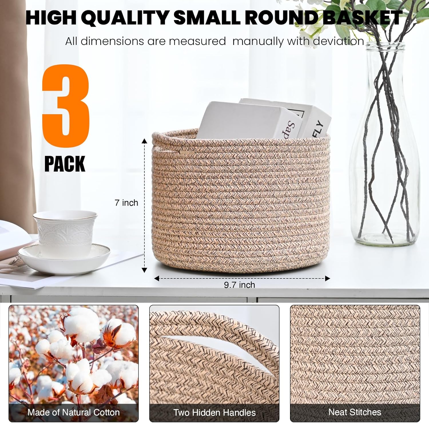 Small Storage Baskets for Organizing, Organizer Baskets for Shelves, Small Woven Basket for Storage, Cute Cotton Rope Basket for Gifts Empty, 9.7"×9.7"×7" (3 Packs) Brown