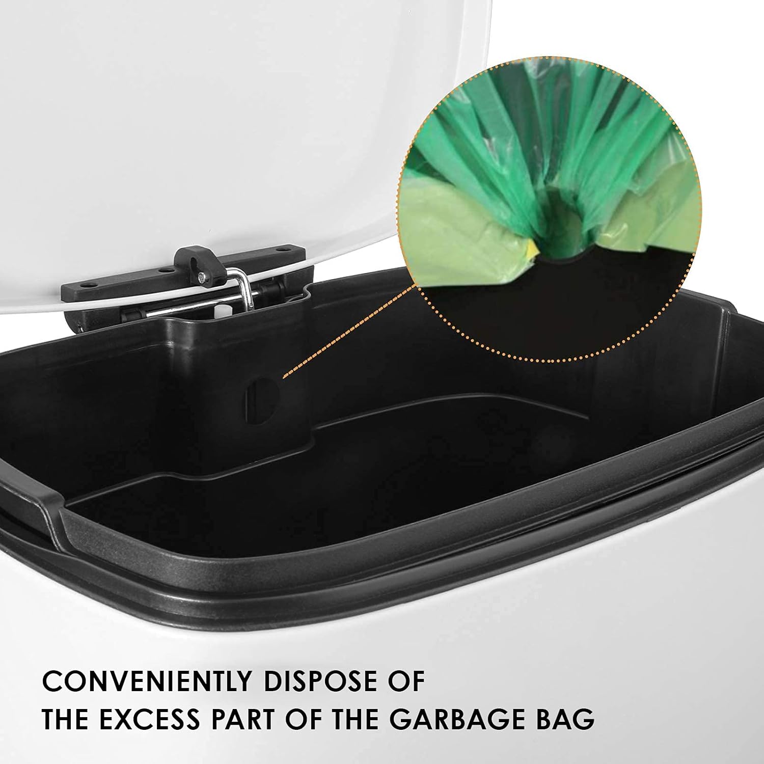 - 【REMOVABLE INNER BARREL】Kitchen trash can is equipped with a detachable plastic inner bucket, the straight shape can hold more trash and facilitate the replacement of trash bags. Inner barrel has no ends and gaps, which is very convenient for daily cleaning.When the garbage bag accidentally bursts and overflows, you can easily lift the removable inner bucket for cleaning.