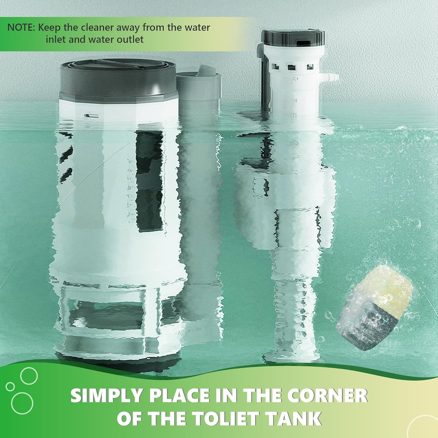 - Easy to Use: Simply place a piece of toilet tank cleaner tablet into the tank (away from the spout and inlet) and let it fully dissolve for at least 30 minutes;(Please note, do not remove the water-soluble transparent protective film)