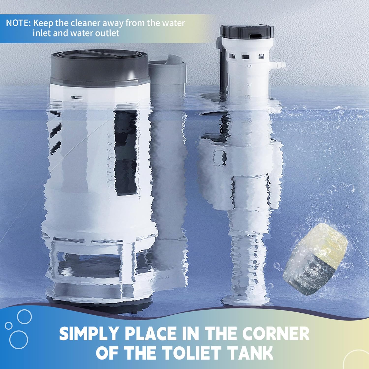 - Easy to Use: Simply place a piece of toilet tank cleaner tablet into the tank (away from the spout and inlet) and let it fully dissolve for at least 30 minutes;(Please note, do not remove the water-soluble transparent protective film)