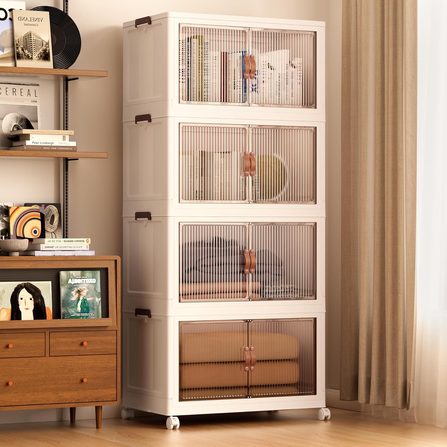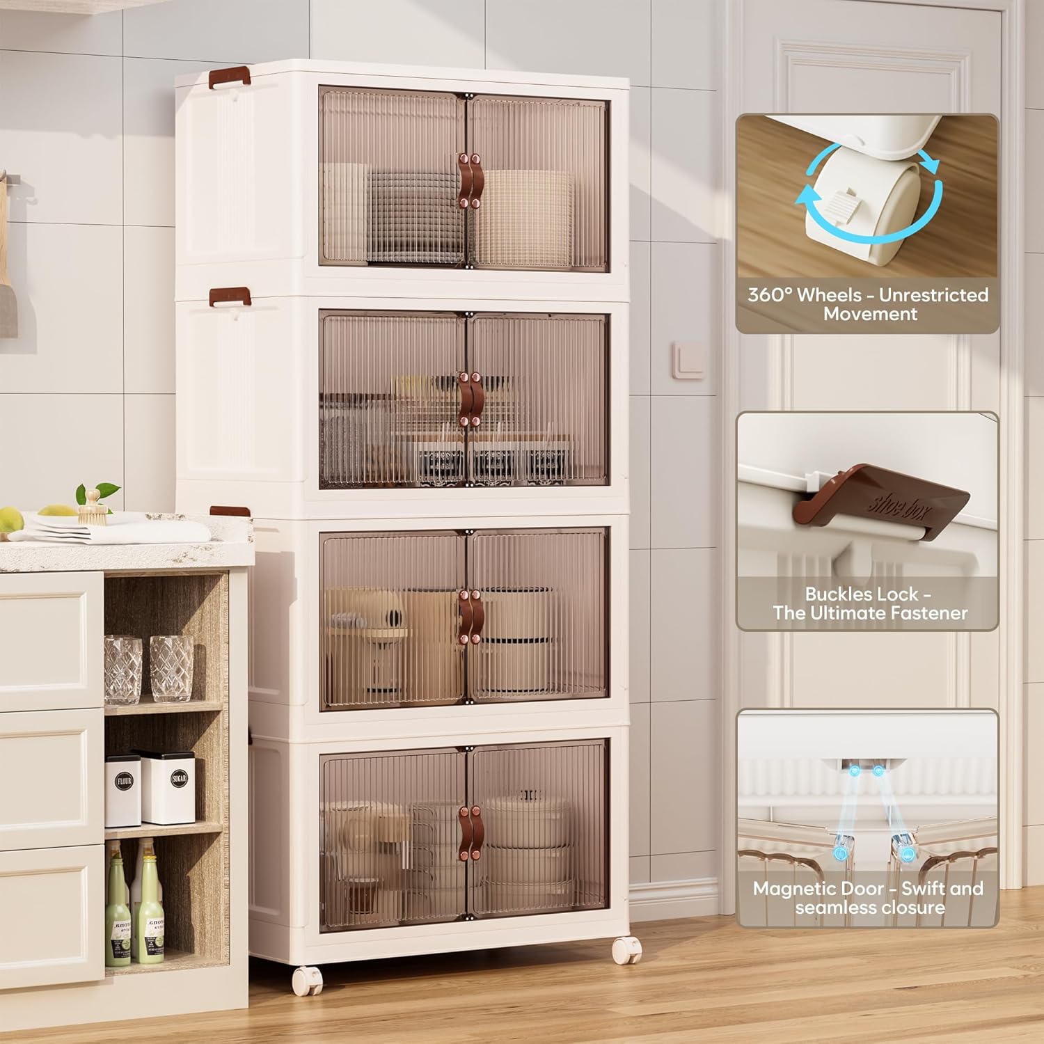 - 【Magnetic Doors & Rotating Wheels】The bins offer two opening options: front or top. The magnetic closure allows easy access. The 4 rotating 360-degree wheels make them easy to move, ideal for use in storage containers and closet organization in any room like your closet or bathroom.