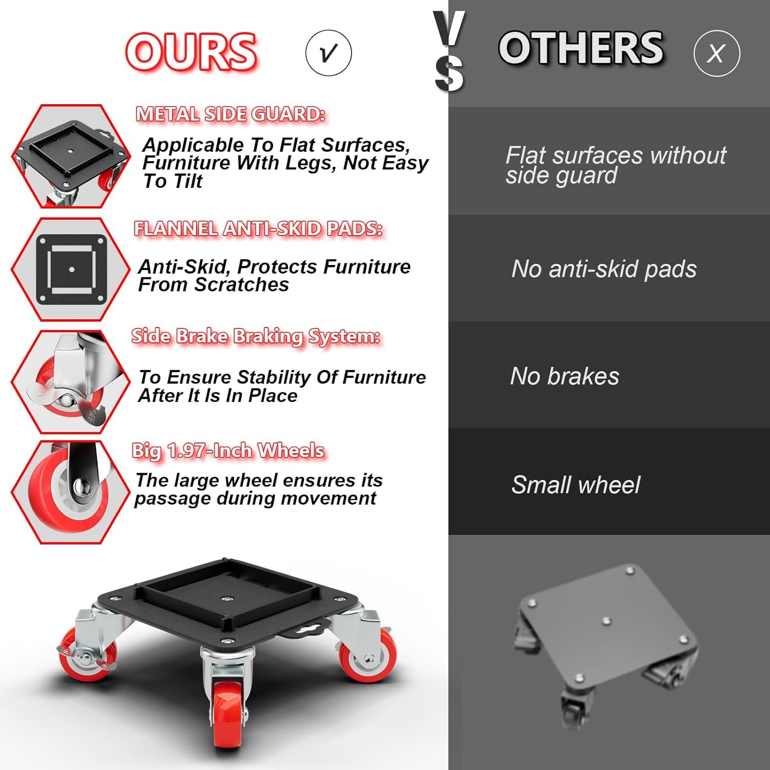 - [Removable Side Guard Design]:This upgraded heavy duty furniture dolly features secure metal side guards that stabilize items with legs,preventing tipping during transport.Ideal for safely moving tables,chairs,and more,this design ensures controlled and safe furniture transportation.