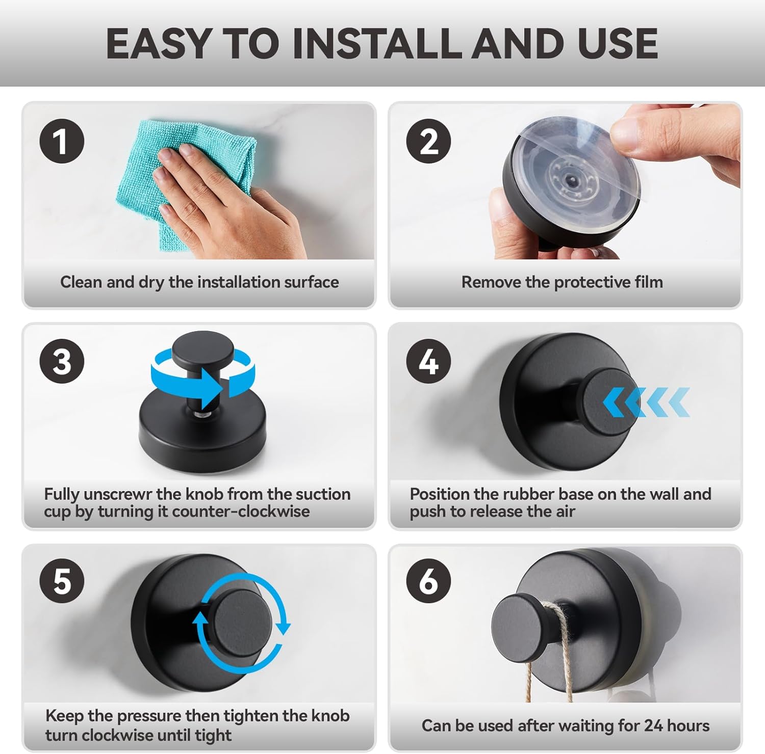 - NO-HOLE INSTALLATION: Suction cup hooks for shower adopts a tool-less, no-drill easy installation to avoid wall damage, simple and removable for reuse, and the can be used in conjunction with any other bathroom accessories. NOTE: When installing the suction cup base must be pressed to expel air to make the product more stable