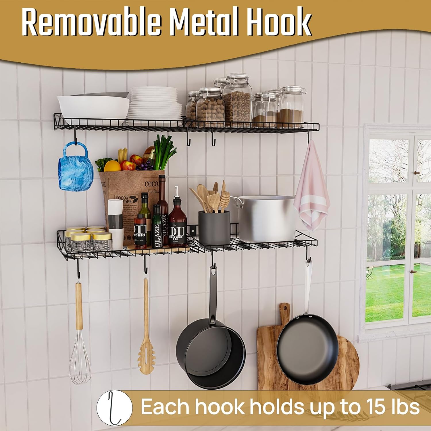 - WIDELY USED: Wire Wall Shelf is perfect for installation in garages, basements, offices, storage rooms, laundry rooms, living rooms, kitchens and bathrooms, etc. The large wall shelves help store canned foods, storage boxes, shoes, documents, towels, clothes, kitchen supplies or practical tools.