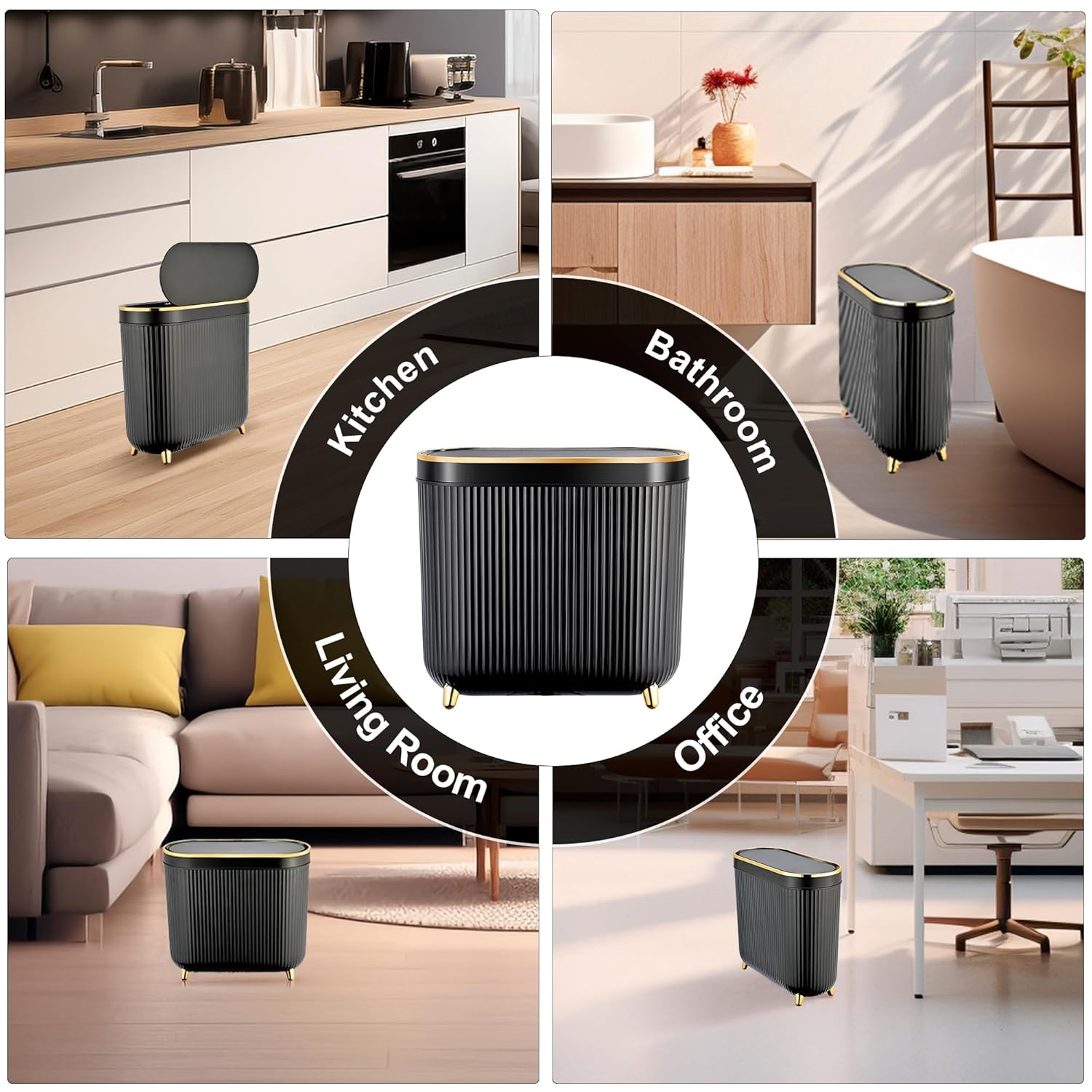 - Stylish & Unique Design - The appearance of this product is equipped with novel wave stripes, bringing visual aesthetics along with being anti-slip. With its modern oval-shaped design, the narrow trash can turns out to be great in bathroom, kitchen and other rooms while taking up less space.