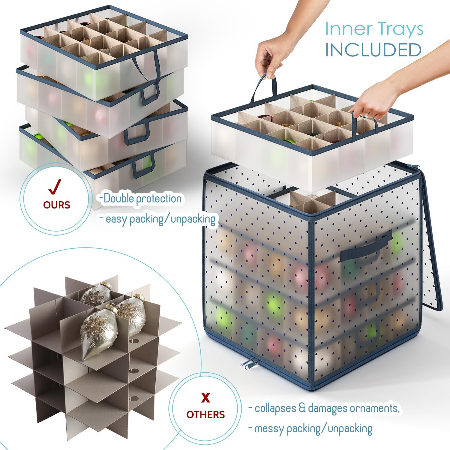 Hearth & Harbor Christmas Ornament Storage Box With 4 Inner Tray Dividers - Plastic Ornament Storage Container For 64 Holiday Ornaments or Decorations
