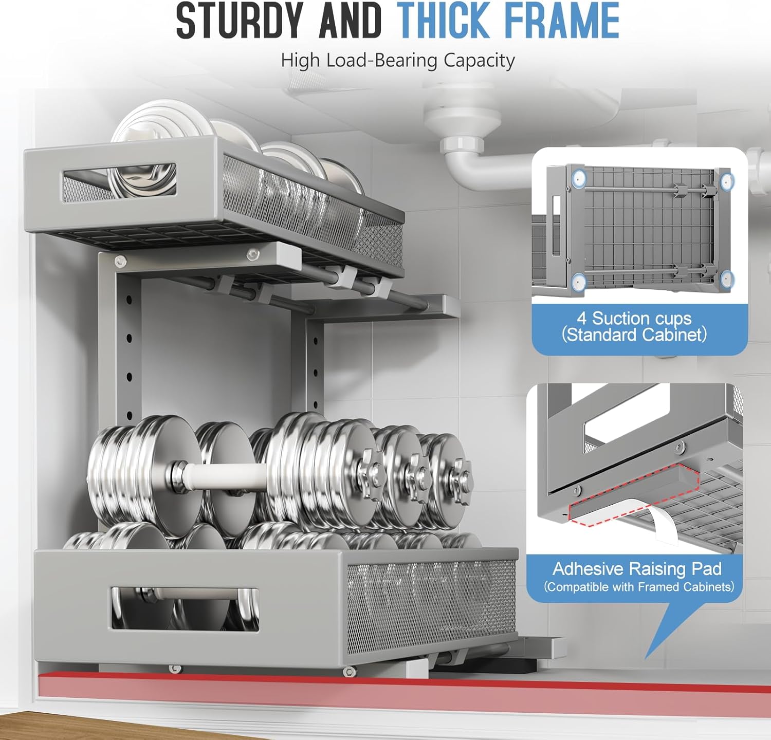 1 Pack-11.4"-16.14" H Under Sink Storage Organizer, Large 2-Tier Elegant Mesh Pull Out Shelf for Kitchen & Bathroom Cabinet Organization, L-Shaped, Adjustable Height-Gun Gray