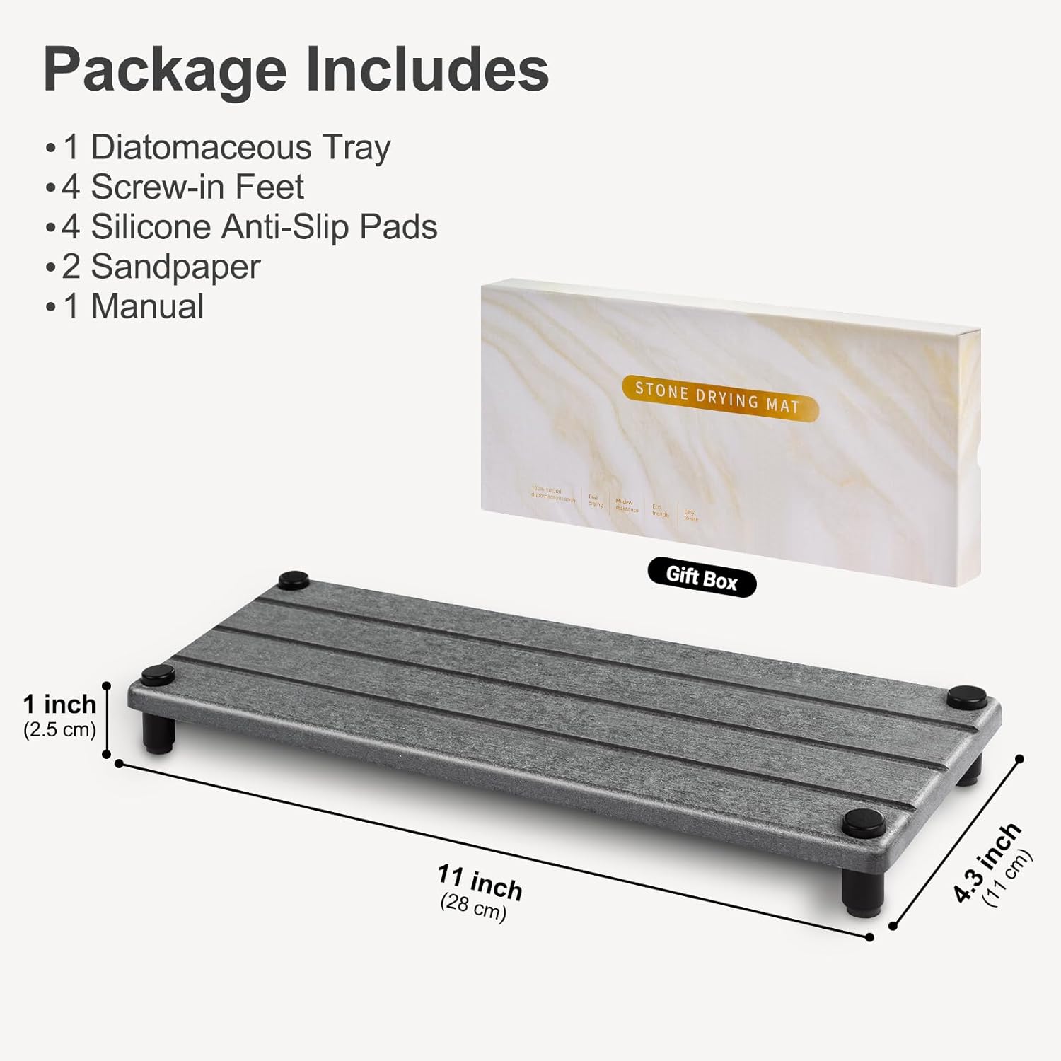 - What’s Included: One diatomaceous tray, four stainless steel screw sets, four silicone anti-slip pads, two sandpaper, and one manual. Tray size: 11 L x 4.3 W x 1 H inches.